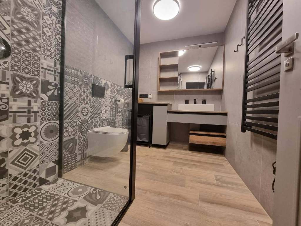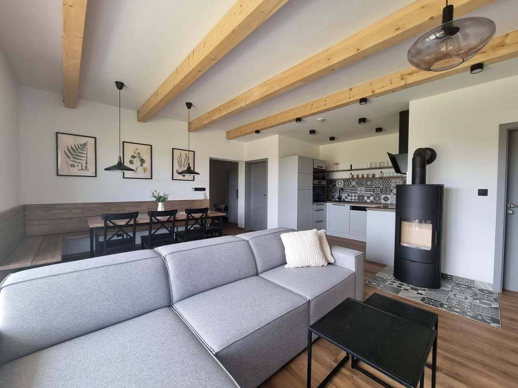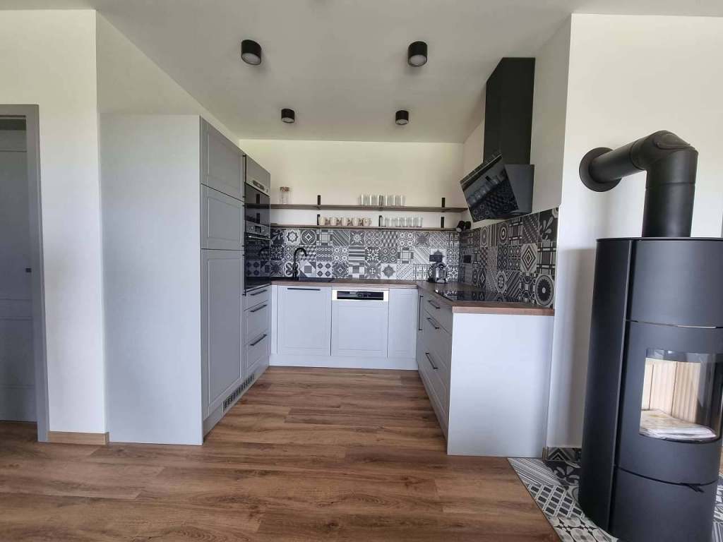 Kuchyně: lednice s mrazákem, mikrovlnná trouba, trouba, indukční deska, myčka, dřez, kávovar, rychlovarná konvice. Obývací pokoj: sedací souprava, velká chytrá TV.
