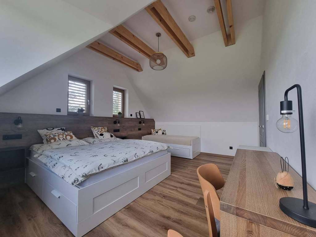 V chalupě jsou k dispozici 4 ložnice, 4 koupelny, 2 kuchyně, obývací prostory, venkovní terasa v přízemí, prostorný balkon v podkroví a oplocená zahrada. V každém patře je kuchyňský kout, jídelna spojená s obývacím pokojem, dvě ložnice a dvě koupelny. Každá z ložnic má manželskou postel + samostatnou postel, která jde rozložit na dvě plnohodnotná lůžka. Kuchyně jsou plnohodnotně vybaveny.