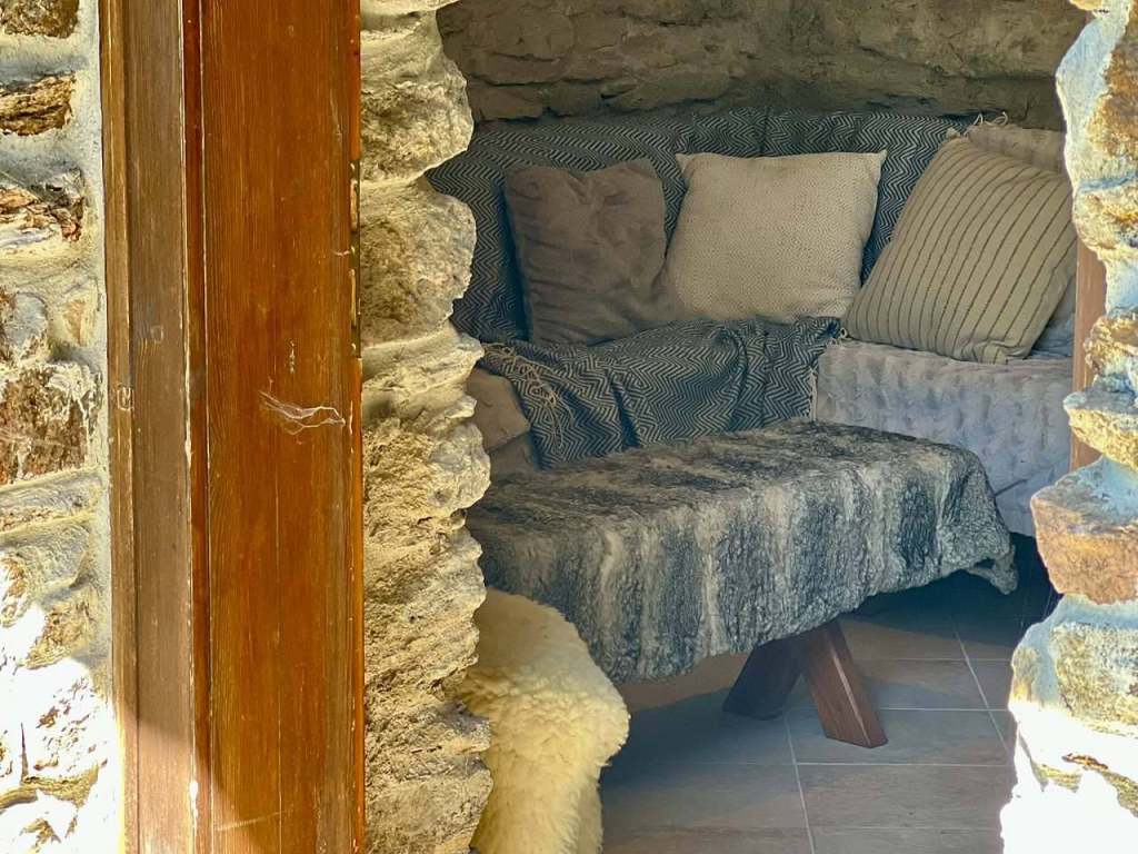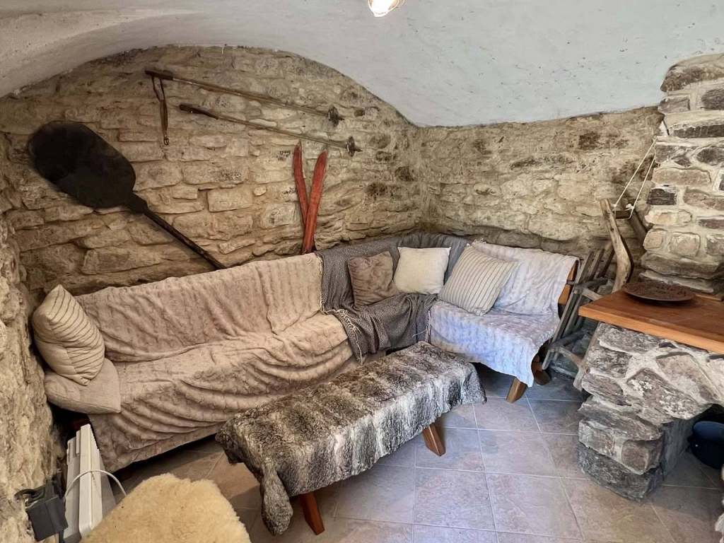 Kamenná část chalupy zahrnuje ještě stylovou místnost s posezením na kožešinách a dále kamennou ledárnu s policemi, která i v létě výborně slouží jako spižírna.