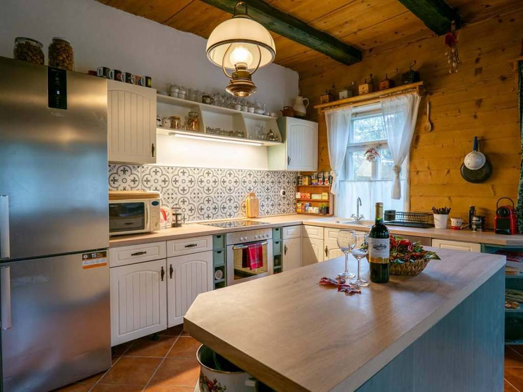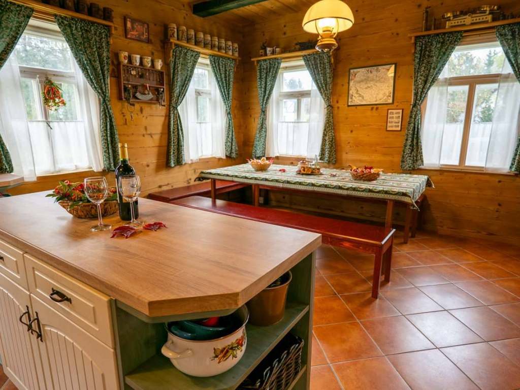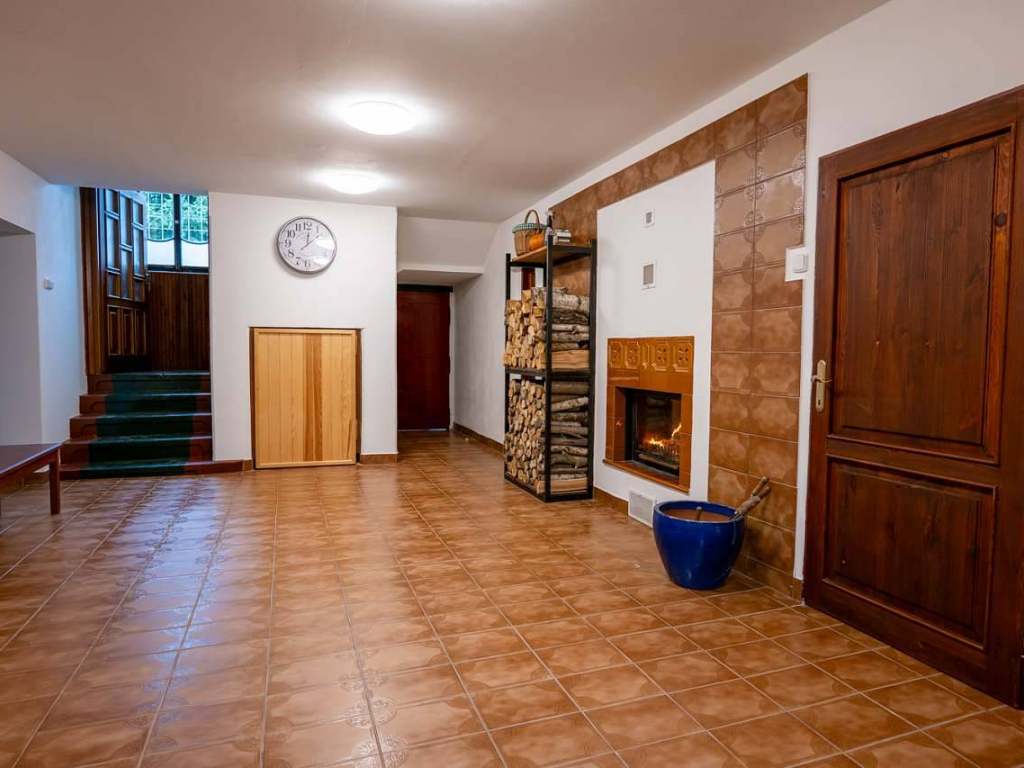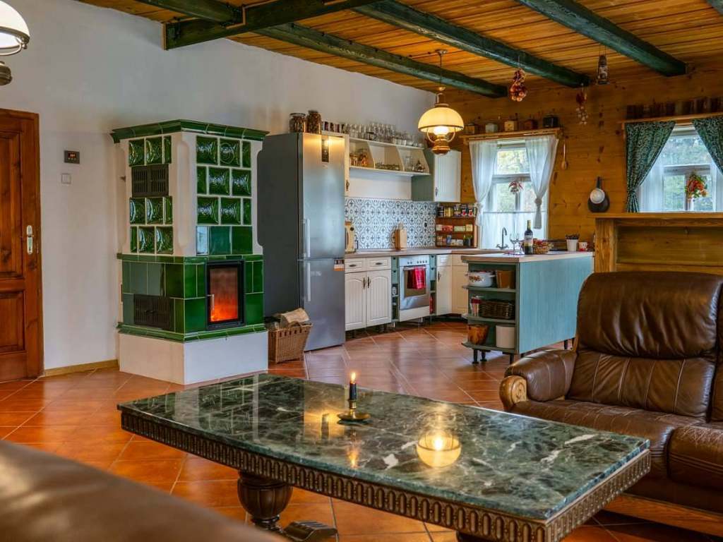 Srdcem chalupy útulná společenská místnost s velkým jídelním stolem pro deset osob, kuchyňskou linkou vybavenou všemi potřebnými spotřebiči a centrálně umístěnými stavěnými krbovými kamny, které vytápějí tuto hlavní obytnou část a vytvářejí příjemnou atmosféru. Ze společenské místnosti je přímý vstup na zahradu a k venkovní pergole s posezením. Kuchyně: velká lednice s mrazákem, čtyř plotýnková varná deska, elektrická trouba, mikrovlnná trouba, varná konvice, kávovar Nespresso, tyčový mixér, sušička na houby a ovoce, nádobí, příbory a talíře atd. Elektronika: retro gramofon s CD, kazetovým přehrávačem, USB, AUX a Bluetooth. Na chodbě knihovna s výběrem knih pro malé i velké.