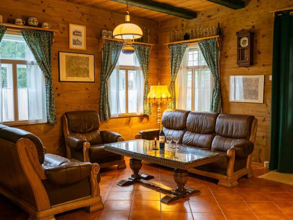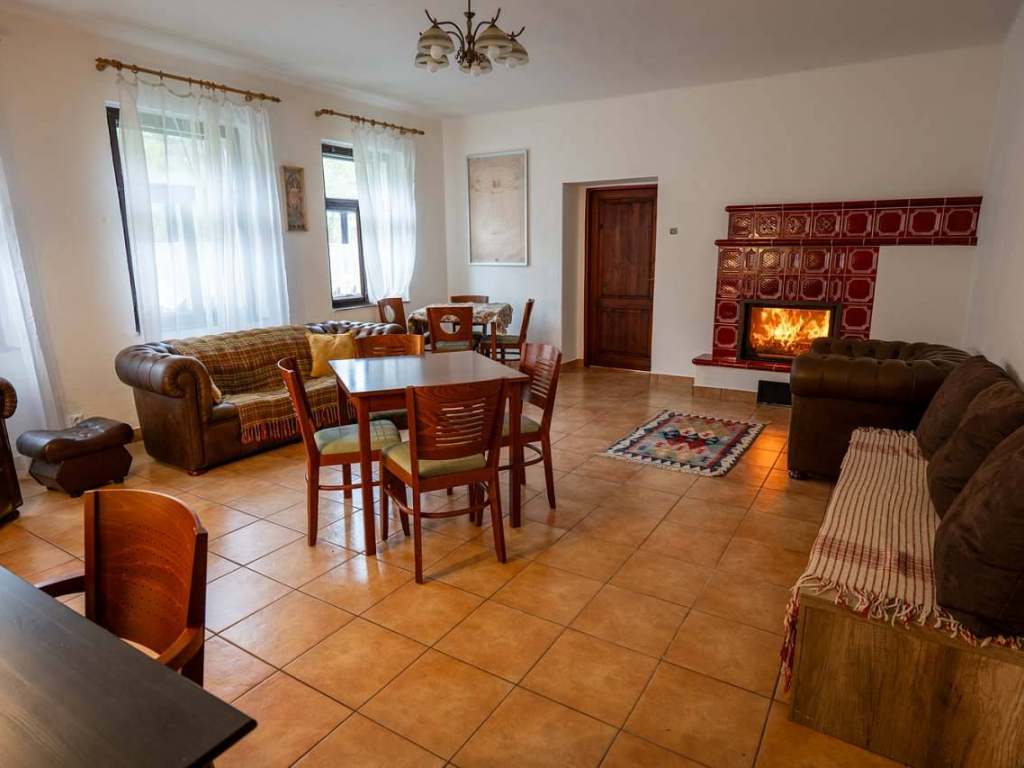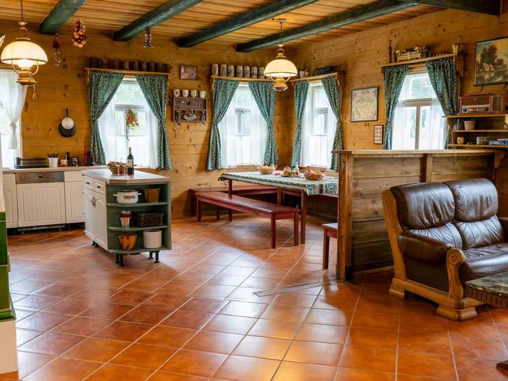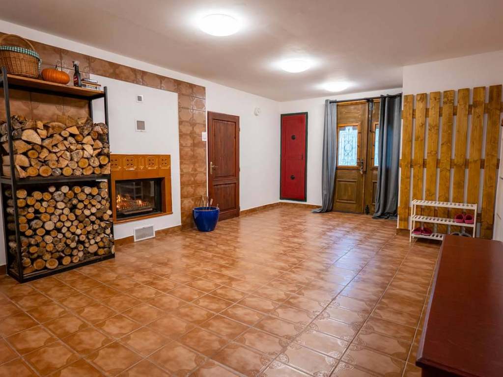 Srdcem chalupy útulná společenská místnost s velkým jídelním stolem pro deset osob, kuchyňskou linkou vybavenou všemi potřebnými spotřebiči a centrálně umístěnými stavěnými krbovými kamny, které vytápějí tuto hlavní obytnou část a vytvářejí příjemnou atmosféru. Ze společenské místnosti je přímý vstup na zahradu a k venkovní pergole s posezením. Kuchyně: velká lednice s mrazákem, čtyř plotýnková varná deska, elektrická trouba, mikrovlnná trouba, varná konvice, kávovar Nespresso, tyčový mixér, sušička na houby a ovoce, nádobí, příbory a talíře atd. Elektronika: retro gramofon s CD, kazetovým přehrávačem, USB, AUX a Bluetooth. Na chodbě knihovna s výběrem knih pro malé i velké.