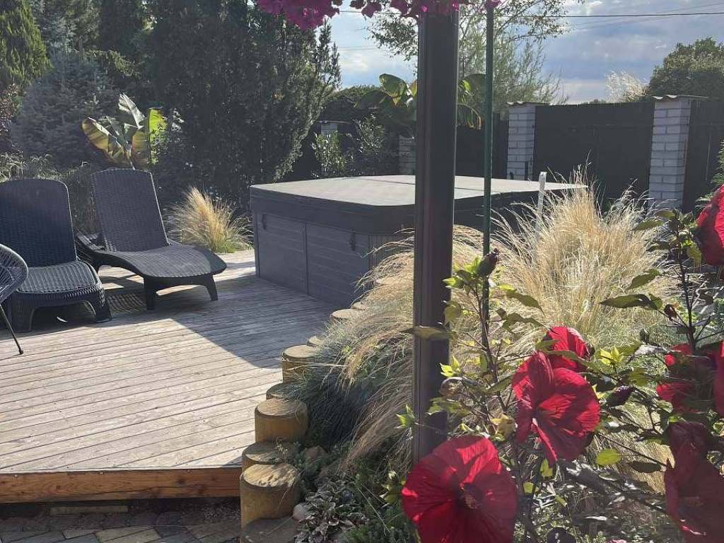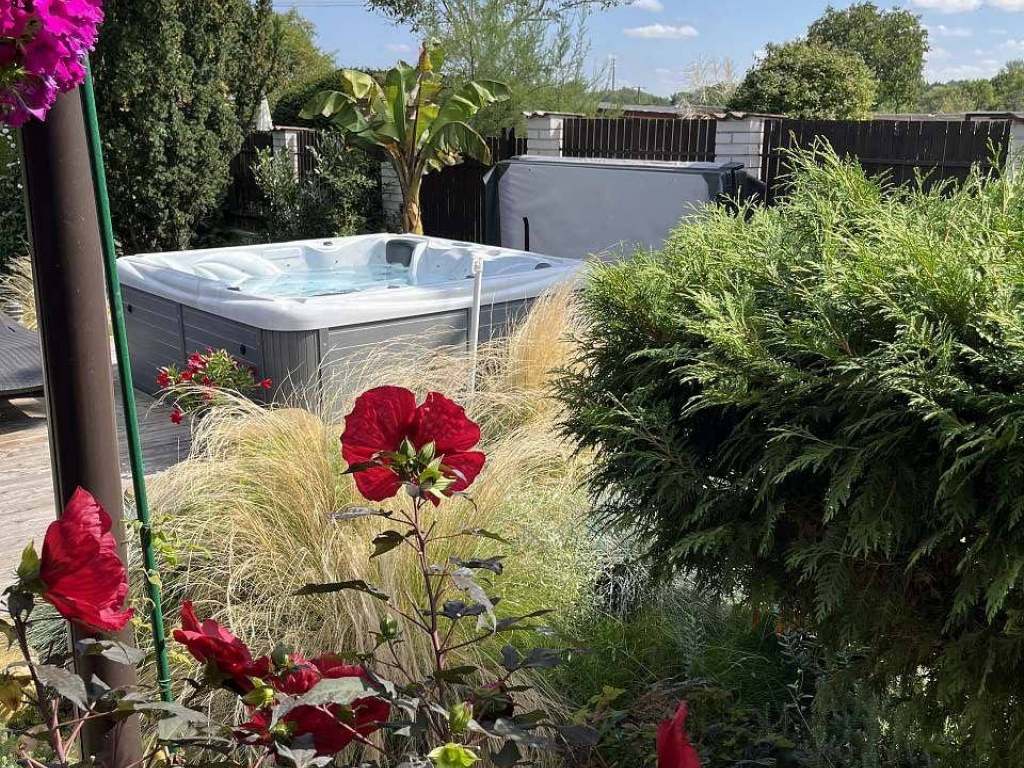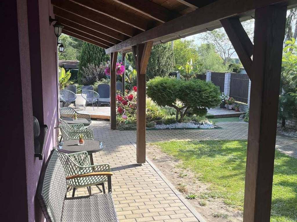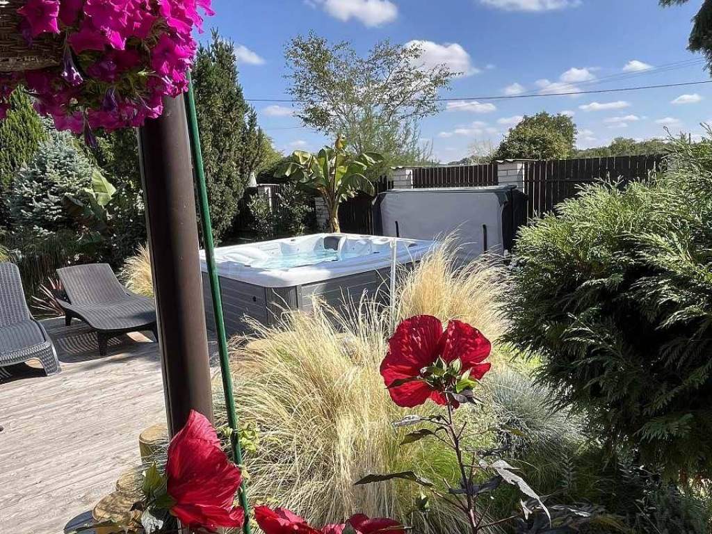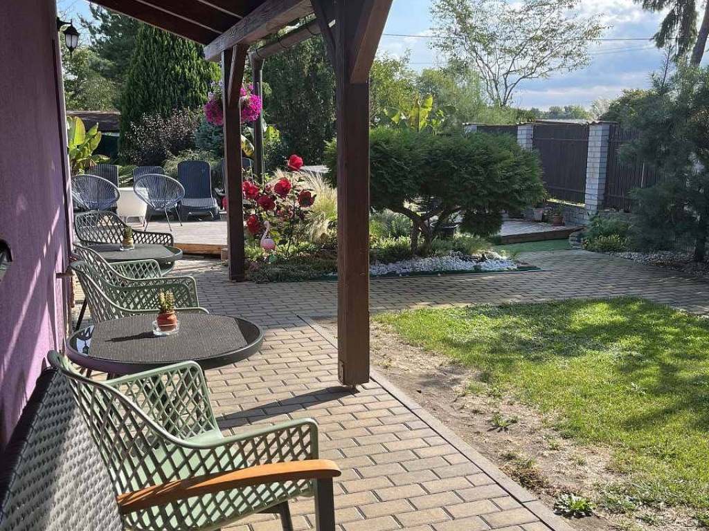 Terasa s vířivkou pro 5 osob, posezení pod pergolou s grilem, herna s vinotékou a stolním fotbalem, elektronické šipky, solární sprcha, dětské pískoviště, dětský koutek.