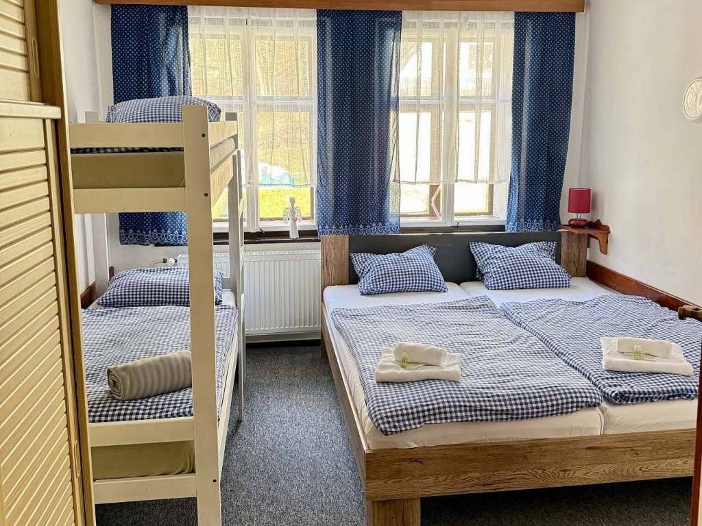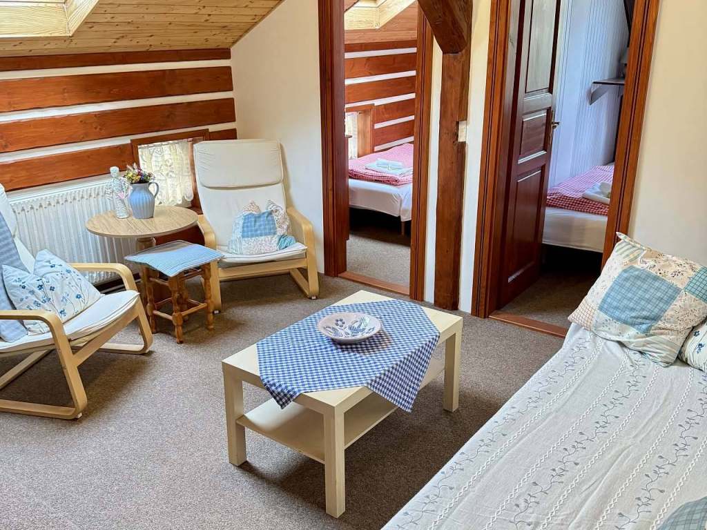 5 = 6 osob rodinný pokoj (dvě ložnice s manželskými postelemi a obývací pokoj s rozkládacím gaučem).