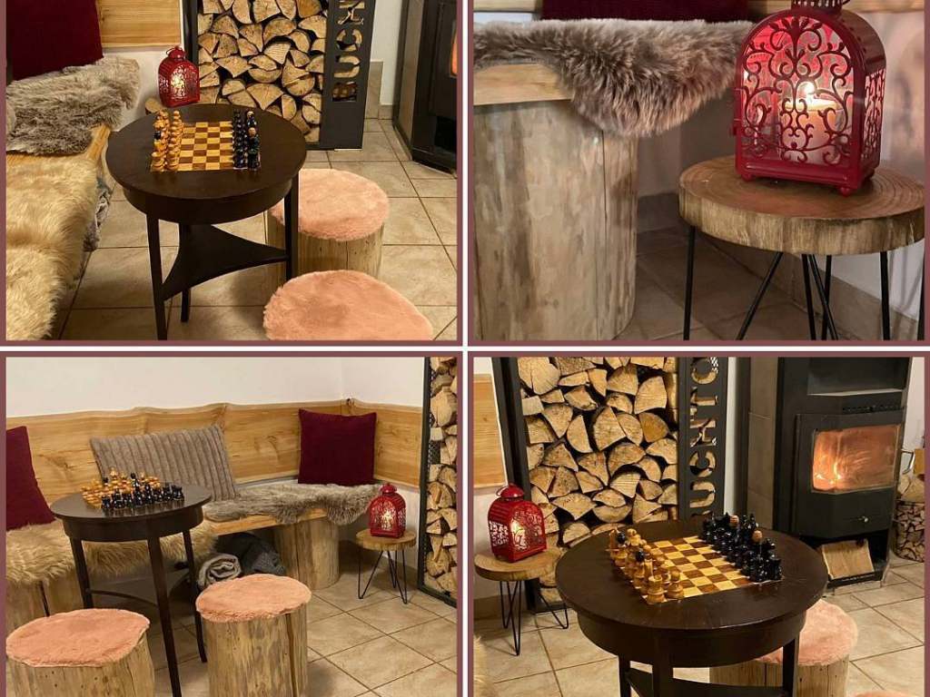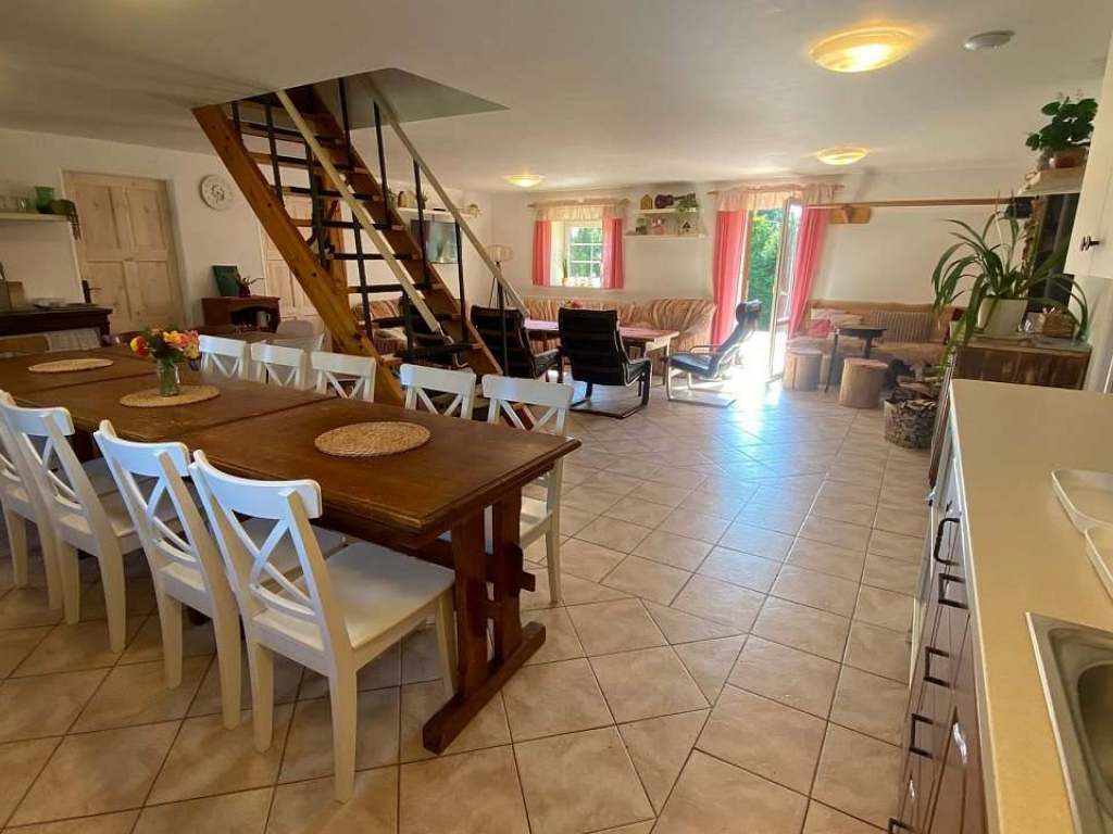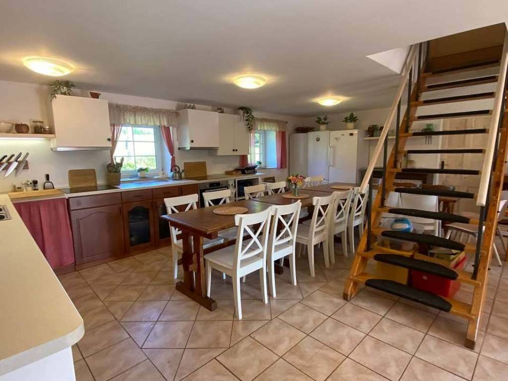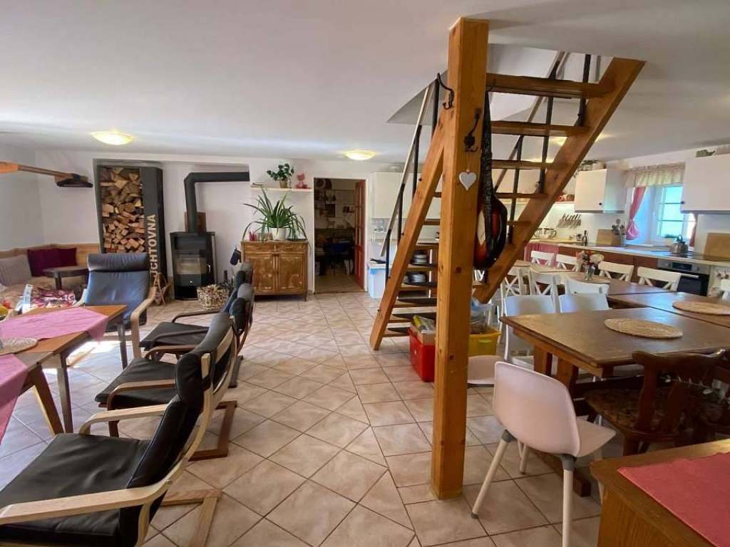 V chalupě je společná plně vybavená kuchyň a velká společenská místnost s východem na terasu, s pípou, WIFI připojením a krbovými kamny.