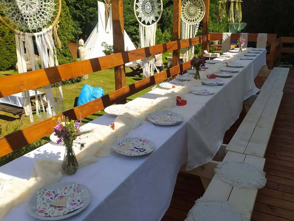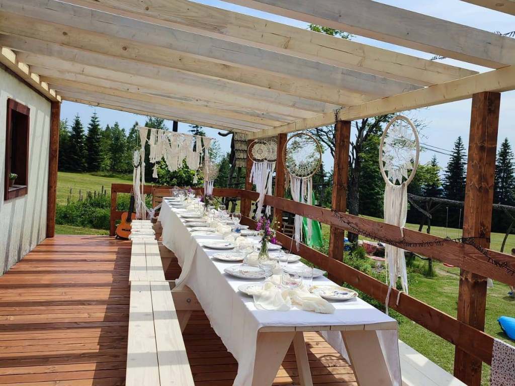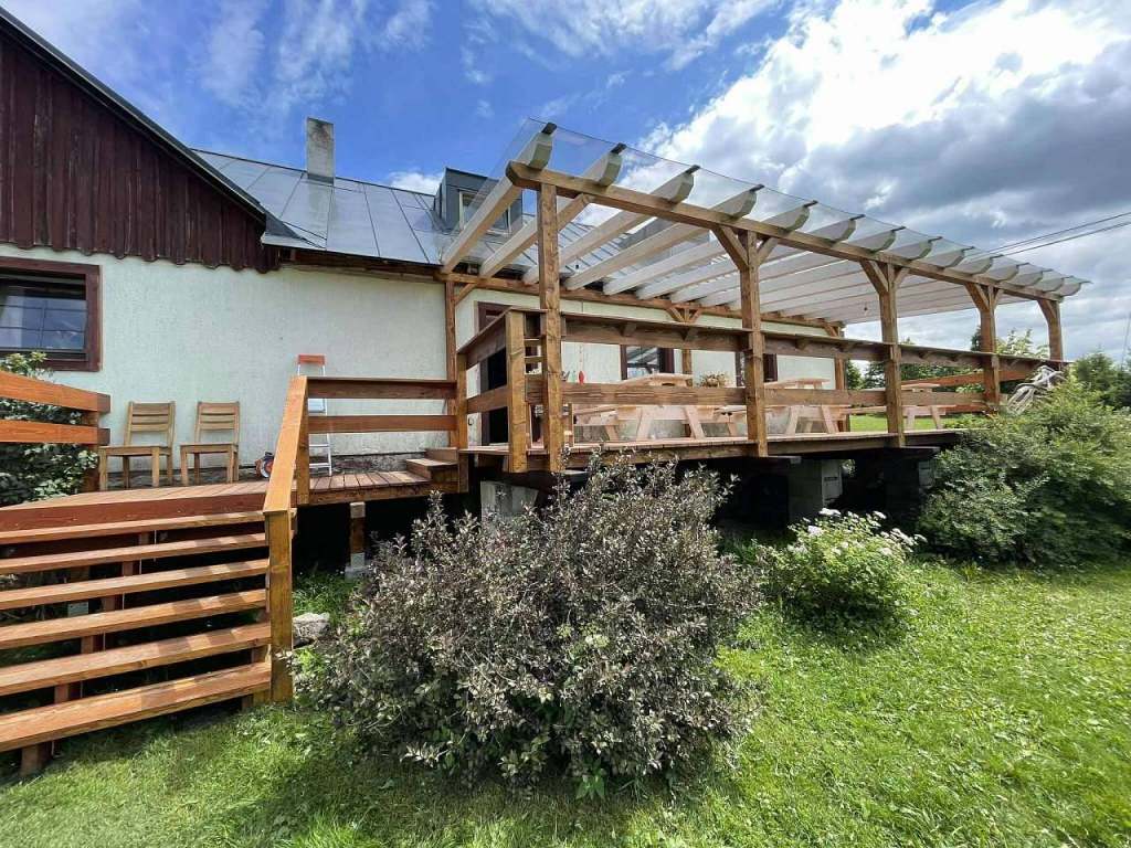 Z terasy sejdete na zahradu, kde je dětský hrad, skluzavka, pískoviště, houpačky, trampolína a v létě dětský bazén. Dále je zde travnaté hřiště na volejbal nebo nohejbal a ohniště s grilem. Za deště je k dispozici i přenosný gril a velké slunečníky na terase. Zahrada je neoplocená a navazují na ni louky a lesní porosty.