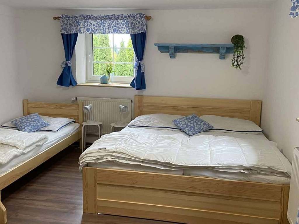 V 1.patře se nachází jeden třílůžkový pokoj, jeden pětilůžkový s možnosti dvou přistýlek a jeden čtyřlůžkový pokoj s palandou.