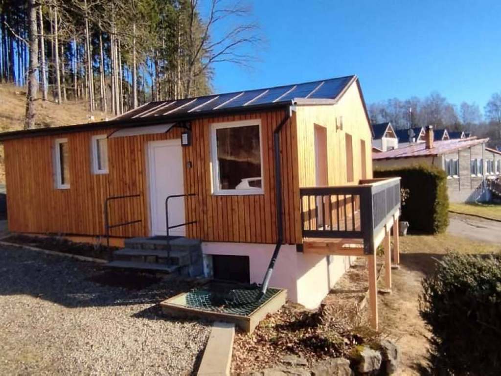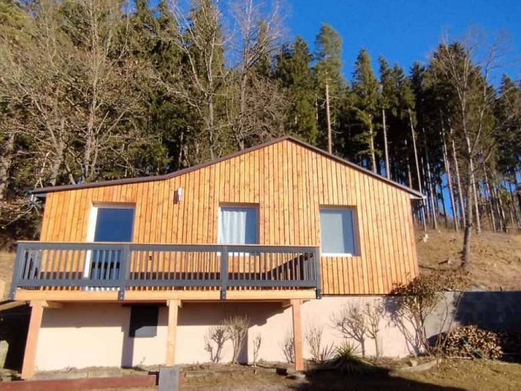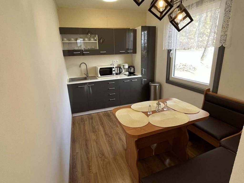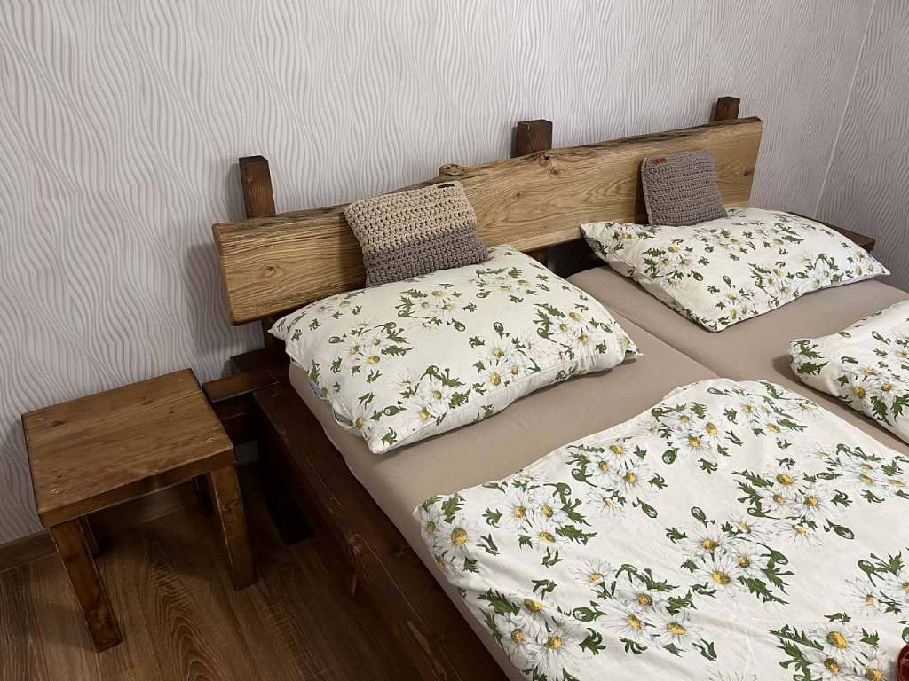 Chata s dvěmi ložnicemi, obývacím pokojem, koupelnou a kuchyňským koutem.