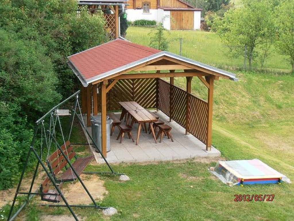 zastřešená pergola, dětské pískoviště, prolézačka se skluzavkou, houpačka pro děti a dospělé, ohniště, pynpongový stůl, prostor pro míčové hry, uzamykatelný prostor pro kola, ohniště venkovní, přenosný gril na dřevěné uhlí.