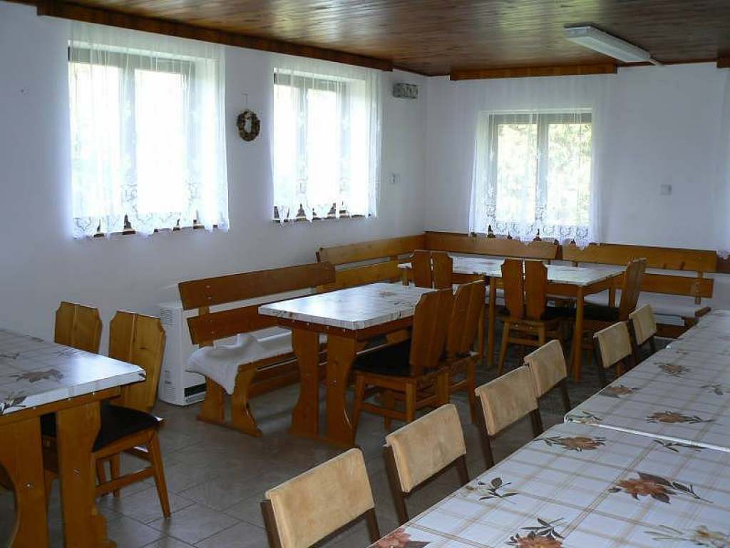 Další součástí chaty je velká jídelna, společenská místnost s TV, úschovna kol.
