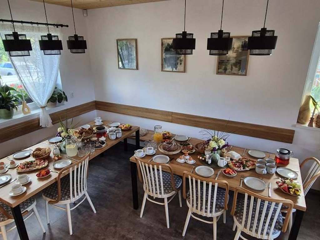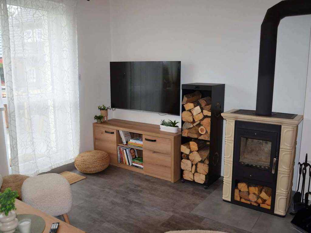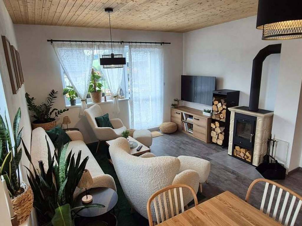 Součástí chaty je prostorná kuchyň s nadstandardním vybavením, která splní očekávání i náročnějších hostů. Na kuchyň plynule navazuje jídelna se dvěma stoly, lavicí a židlemi, která poskytuje dostatek prostoru pro společné stolování celé rodiny či skupiny přátel. V navazujícím obývacím pokoji se nachází pohodlná sedací souprava, dvě křesla, konferenční stůl, televize a krbová kamna, která dodávají místnosti příjemnou atmosféru a útulné teplo v chladnějších dnech. Prostor je ideálním místem pro odpočinek, zábavu i společné večery u praskajícího ohně.