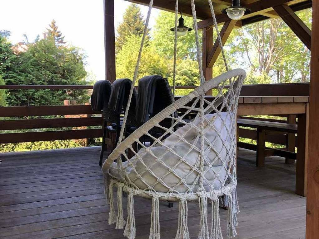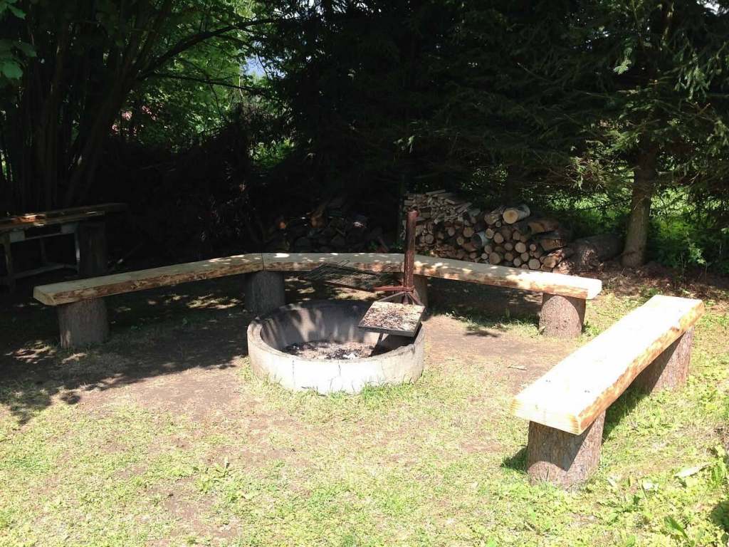 Na pergole je posezení pro 8 osob, houpačka. K dispozici jsou dále 2 lehátka. Další posezení je dole u ohně kde je ohniště s roštem, lávovým kamenem a opékáčky. Přenosný gril.