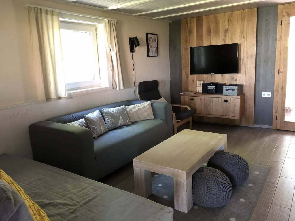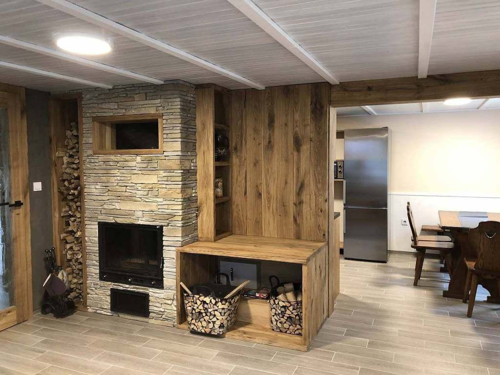 V obývací části najdete jednu 3místnou a jednu 2místnou sedací soupravu, dále je zde Smart TV, HI - FI systém, krbová kamna s výměníkem topící do radiátorů v jednotlivých místnostech. K dispozici je i Wi - FI připojení. Obývacím pokojem vstupujete do jídelní části, kterou dominuje velký jídelní stůl. Jídelní část je spojená s menším kuchyňským koutem vybaveným indukčním sporákem s troubou, myčkou, velkou lednicí s mrazákem, varnou konvicí, mikrovlnou troubou, toustovačem, ručním mixérem a kávovarem DolceGusto. Kuchyň co se týče nádobí je plně vybavená běžné domácnosti. Vše je počítáno pro 8 osob. Vedle kuchyně se nachází malá koupelna se sprchových koutem s termostatickou baterií a umyvadlem.