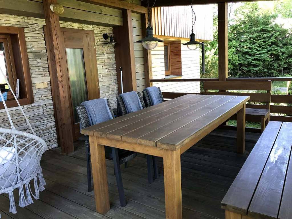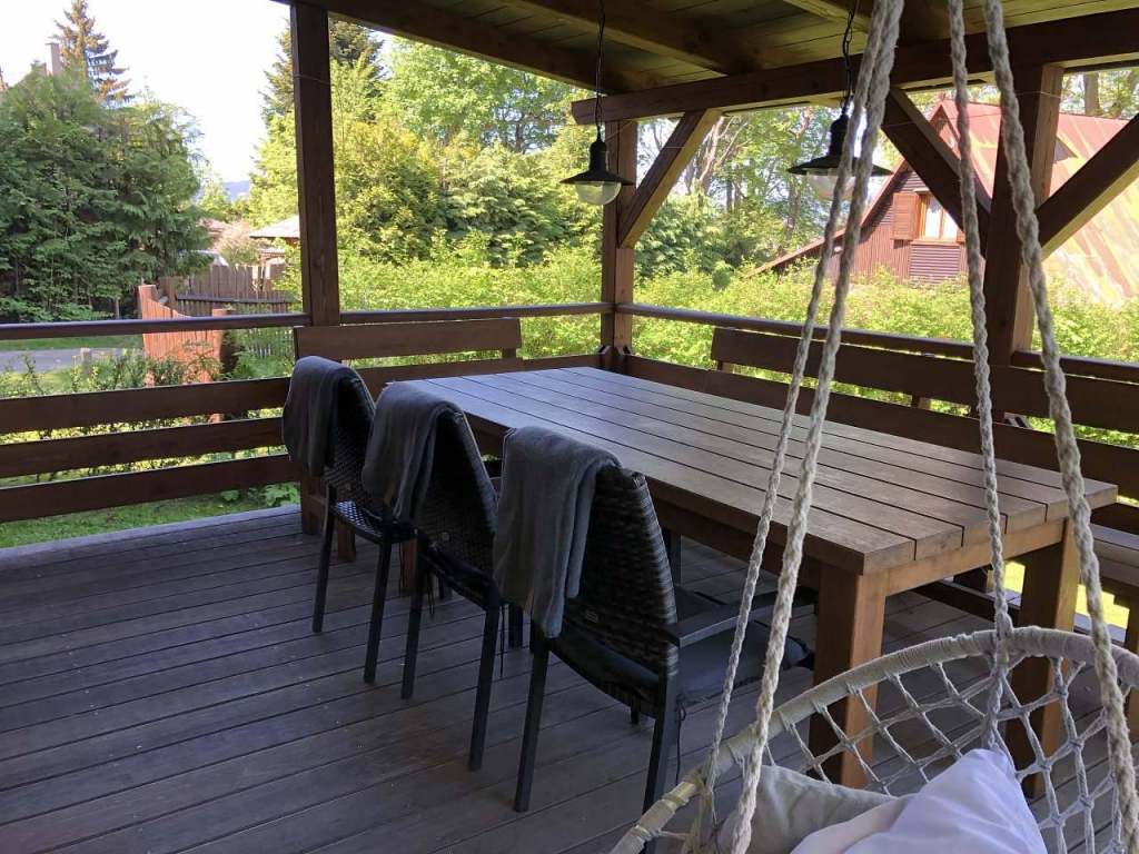 Z obývací části je další hlavní vstup na zastřešenou terasu, ze které je krásný výhled na jezero. Na terase je posezení pro 8 osob, dále houpačka a aretovací sušák na prádlo. Z terasy je volný vstup na zahradu.