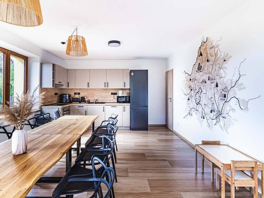 DOMEK nabízí ubytování pro 14 osob ve 3 samostatných apartmánech. 6 ložnic, velká společenská místnost.