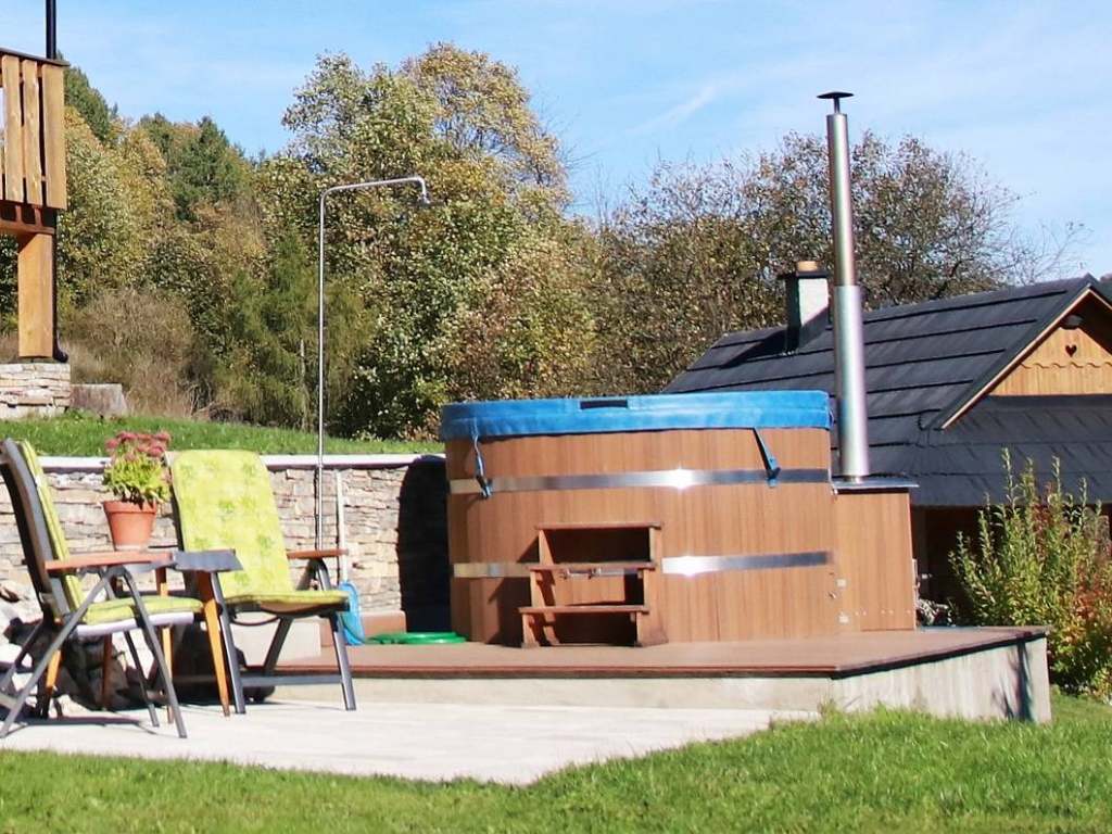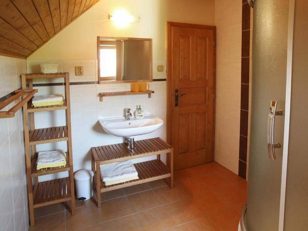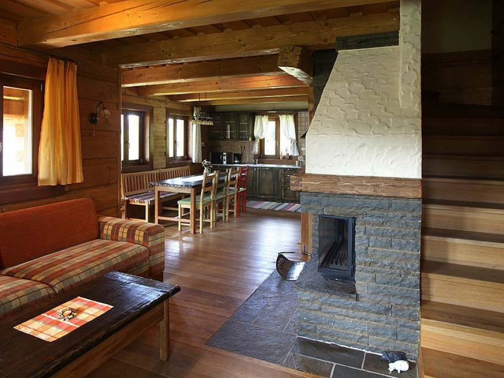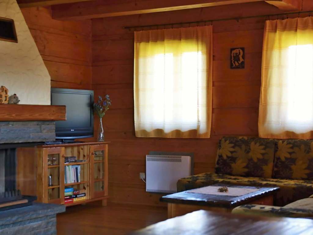 P r í z e m i e: vstupná časť, priestor na odloženie vecí, samostatné WC s umývadlom, obývacia miestnosť spojená s kuchyňou, kuchyňa je plne vybavená modernými spotrebičmi (umývačka riadu, keramická doska na varenie, chladnička s mraziacim boxom, elektrická rúra, mikrovlnná rúra, kanvica). Dostatok kuchynského riadu (tanierov, pohárov, príborov, hrncov atď. ), veľký jedálenský stôl zabezpečí pohodlné stolovanie pre všetkých ubytovaných hostí, obývacia miestnosť umožňuje príjemné posedenie pred krbom a televízorom na pohodlnej veľkej sedačke. Voľné chvíle vám môže spríjemniť aj káblová televízia, rádio s CD, niekoľko DVD nosičov s najznámejšími filmami českej a slovenskej produkcie, spoločenské hry a knihy.