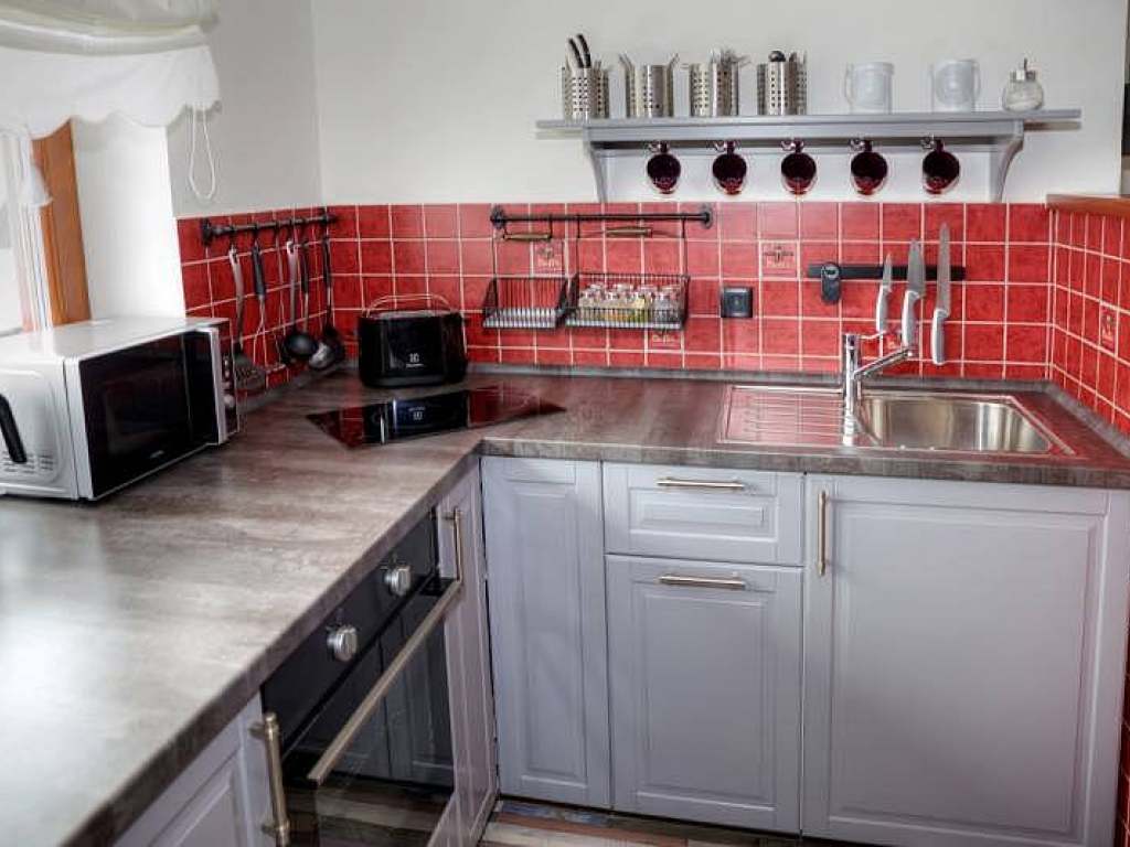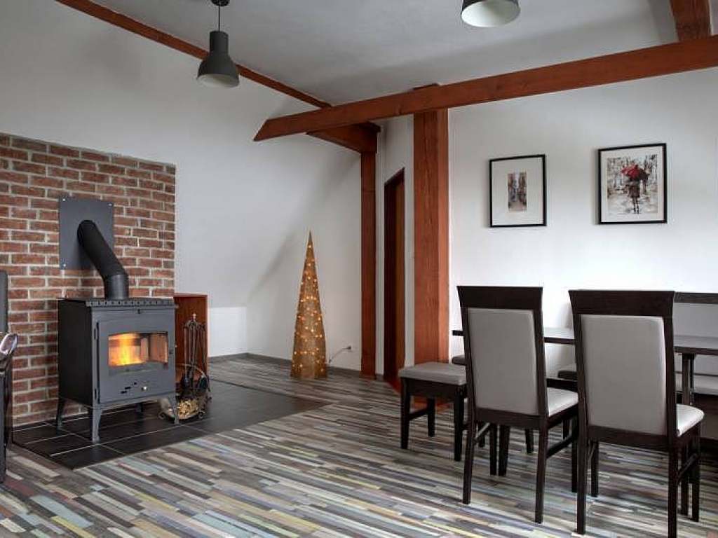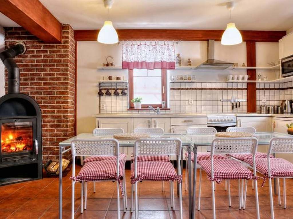 V přízemí obytná místnost s kuchyňským koutem (lednice, el. sporák, mikrovlnná trouba, myčka, rychlovarná konvice, touster, základní nádobí), rohová lavice, krbová kamna.