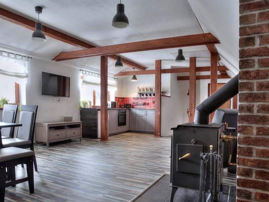 Radimova stodola - kuchyňský kout, jídelní sestava, sedací souprava, krb.