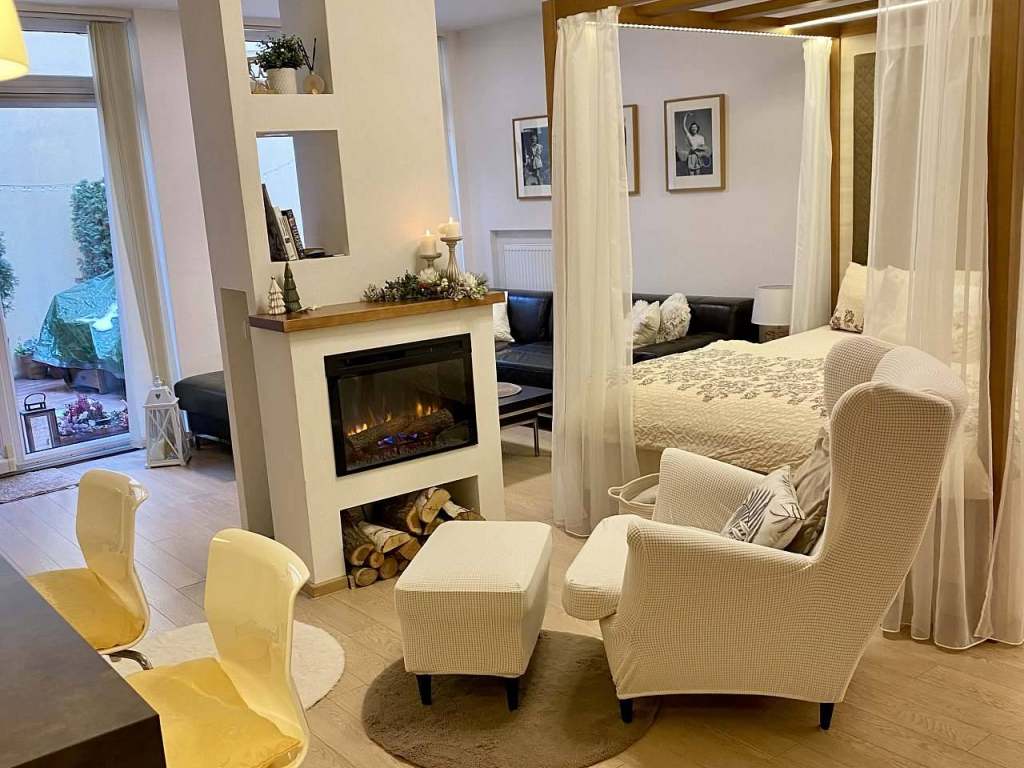 Veliký nadstandardně vybavený apartmán vhodný pro rodiny s dětmi. Je zde veliká rohová kuchyně ( kávovar, myčka, indukce, parní trouba, mixér, velký mrazák, gril), jídelní stůl pro 6 osob, bar s posezením), postel s nebesy, rohová sedací souprava, veliká O2TV, krb a úšák pro romantické večery, vstup přímo na krásný dvůr s posezením + možnost nafouknout dětem i malý bazén :-)), samostatná ložnice s dětskou postýlkou, veliká koupelna s rohovou vanou + pračka, sušička :-)) Všechna okna směřována do klidného dvora a park Na Rybníčku. Na kola vestavná skříň v apartmánu - cyklostezka naproti domu. Pejsci vítáni - park s fontánou Na Rybníčku za domem. Jedno parkovací místo zdarma - 20m od domu. ( po příjezdu obdržíte kartu) Na vyložení věcí si můžete zastavit přímo před domem.