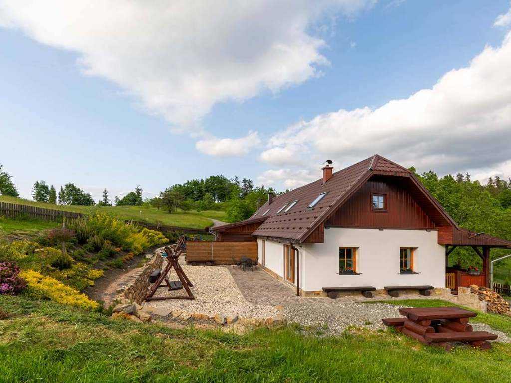 Chalupa Pohoda: venkovní posezení na terase - dvě dřevěné lavice, 2m stůl, 2 křesla, dřevěná houpačka, gril, trampolína, Uvnitř chalupy je kvalitní kuchyňská linka se spotřebiči ( sklokeramická varná deska, el. trouba, mikrovlnka ) vestavná lednice, varná konvice, krbová kamna Jotul, LCD televize, wifi internet, I - pod přehrávač, rádio.