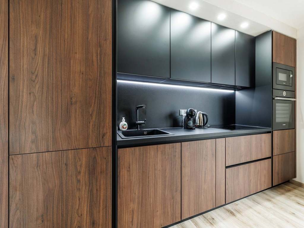 Kuchyň je vybavena indukční deskou, mikrovlnnou troubou, myčkou, horkovzdušnou troubou, lednici s mrazákem, kávovarem a rychlovarnou konvici.