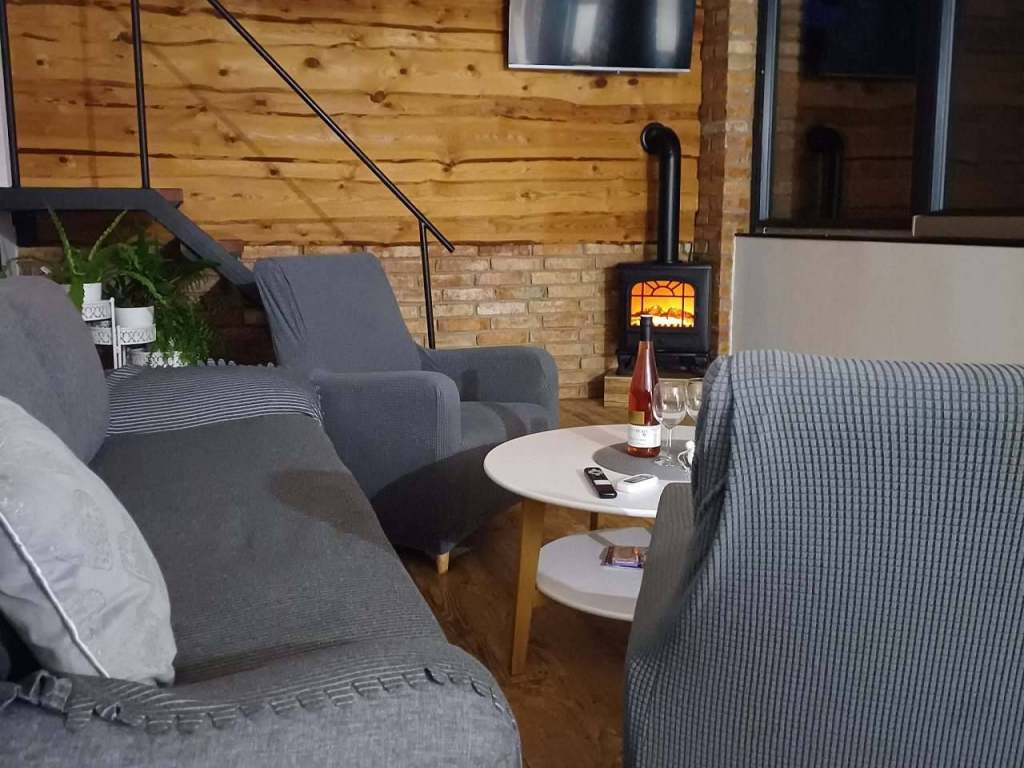 rozkládací pohovka + 3místná pohovka, 2x křesílko, konferenční stůl, krbová kamna.