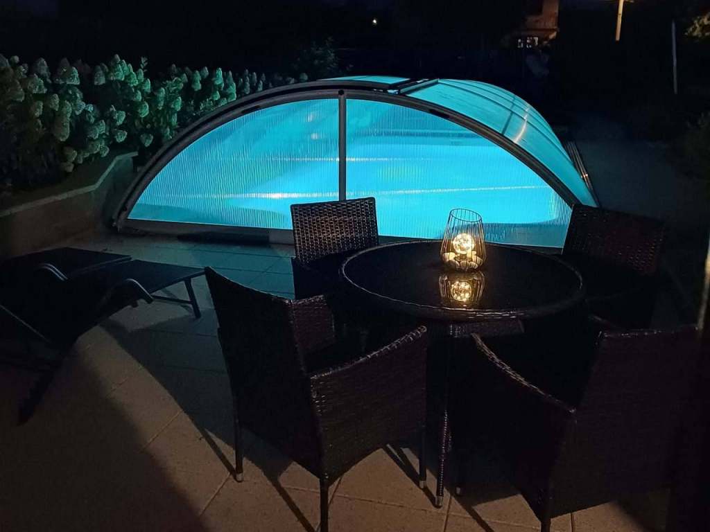 Bazén se zastřešením, slaná voda - koupání i při špatném počasí. Lehátka u bazénu.