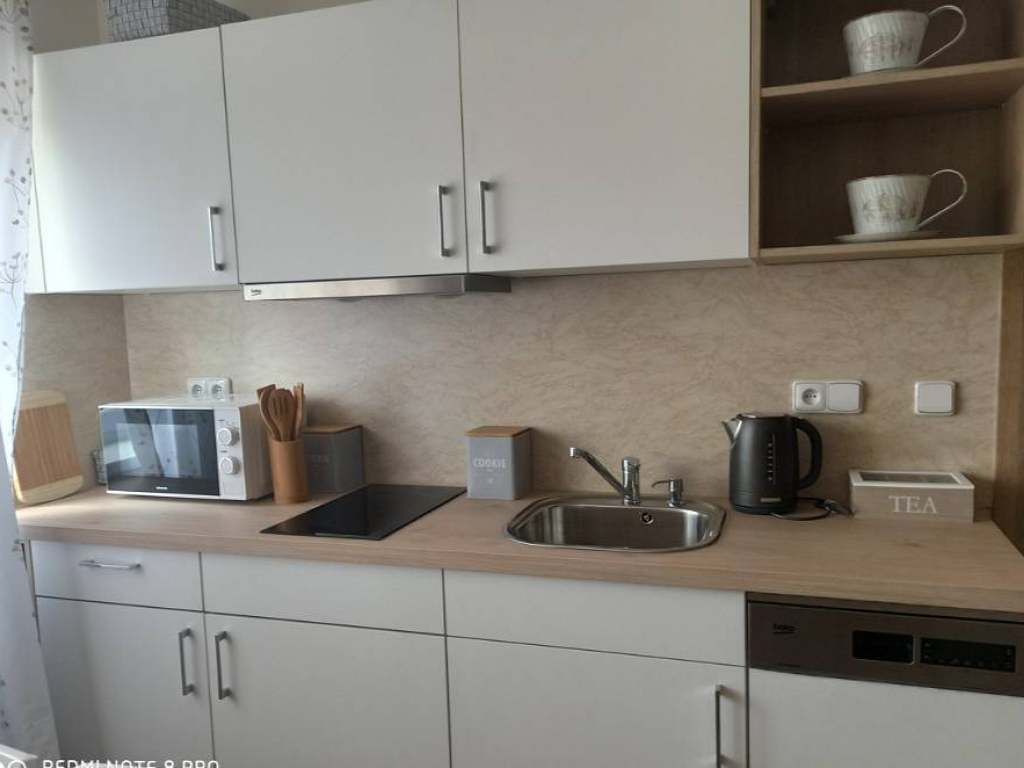 Plně vybavená kuchyně, varná konvice, indukční varná deska, mikrovlnka, toaster, topinkovač, myčka na nádobí, lednice.