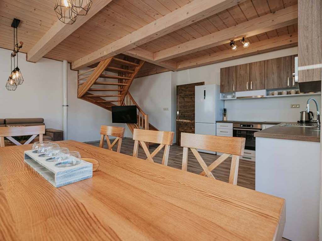 Prízemie apartmánov tvorí veľký otvorený priestor, v ktorom dominuje elegantný nábytok v kombinácii s kvalitnými elektrospotrebičmi. Štýlová kuchyňa Vám poskytne dostatočný priestor na varenie i pečenie. K dispozícii je keramická varná doska, elektrická rúra, kombinovaná chladnička, myčka, rýchlovarná kanvica, mikrovlnná rúra a množstvo kuchynských pomôcok. Pri spoločnom obede si posedíte za príjemným jedálenským posedením. Vzácne chvíle s rodinou či priateľmi si môžete vychutnať v obývacom priestore, kde sa nachádza pohodlný rozkladací gauč a televízor so satelitným príjmom.