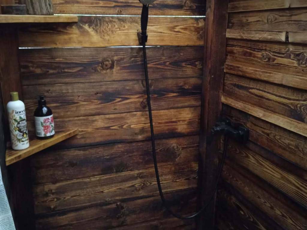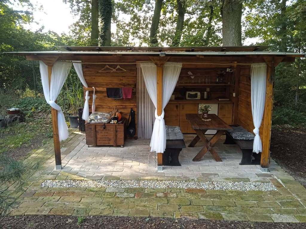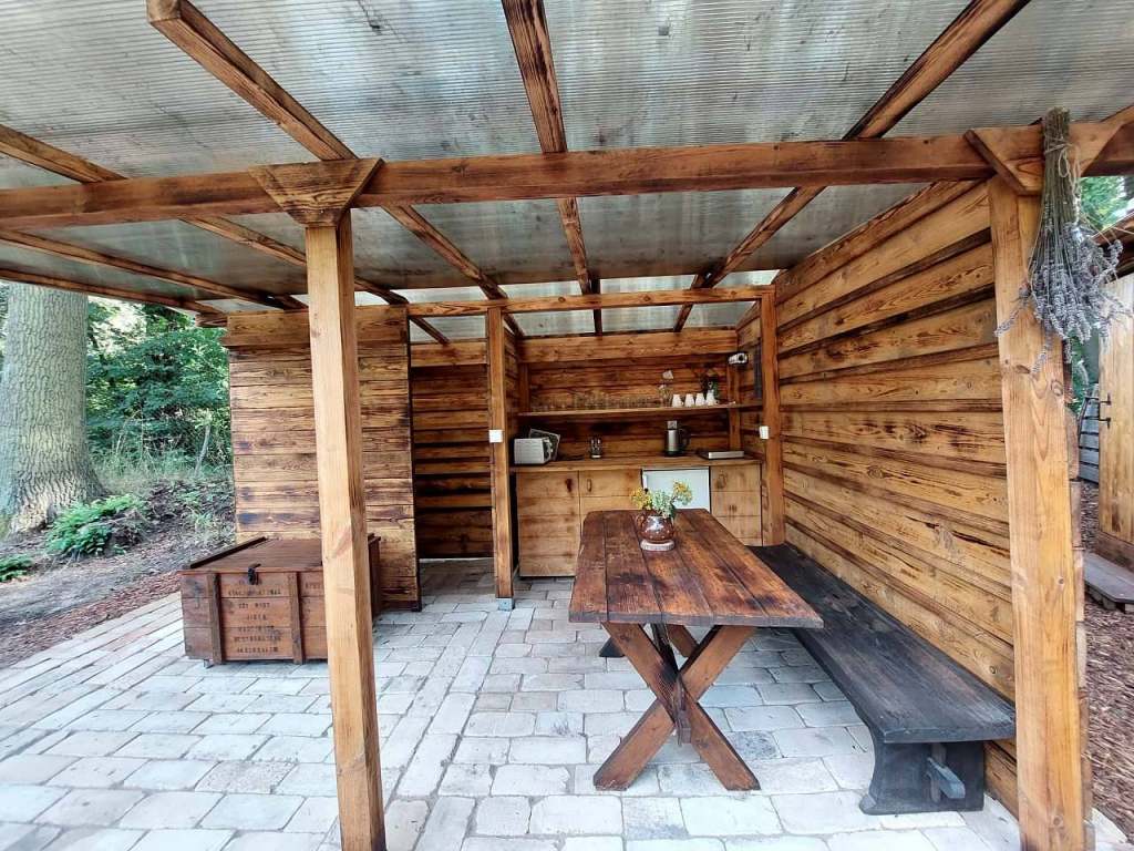 Venkovní krytá pergola: kuchyně s vybavením, sprcha s teplou vodou, stůl s lavicemi (pro 4 osoby).