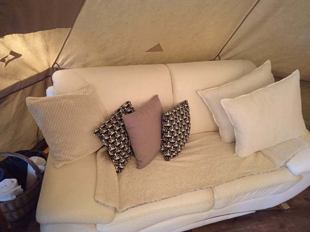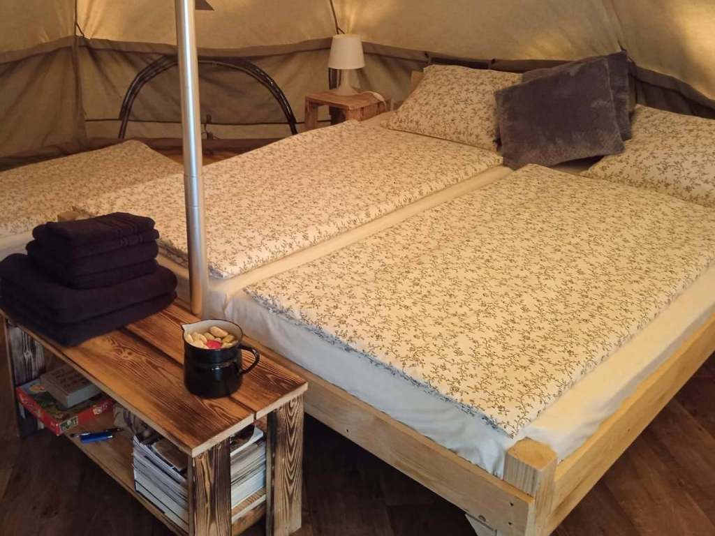 Glampingový stan: 1 manželská postel, gauč, noční stolky, lampička, věšák na prádlo, elektrický krb, rohožka, botník + možnost dvou přistýlek/ matrací.
