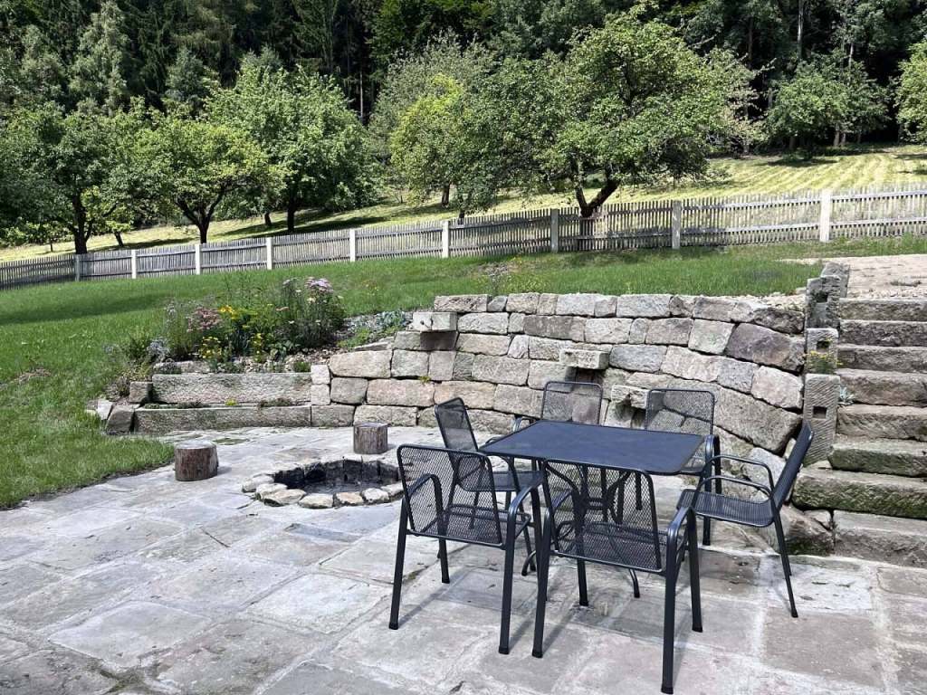 Venkovní zázemí: Za domem je umístěno ohniště, k dispozici je také gril (dřevěné uhlí není k dispozici) a venkovní nábytek.