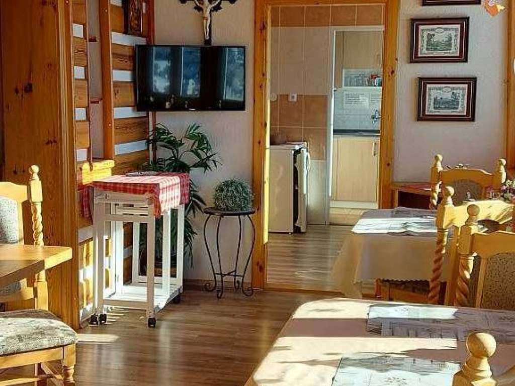 V objektu je pro pronájem celé chalupy větší kuchyň s vybavením (lednička, mikrovlná trouba, sklokeramický sporák s elektrickou troubou, myčka na nádobí atd. ).