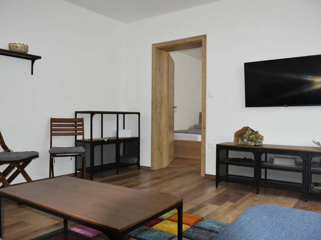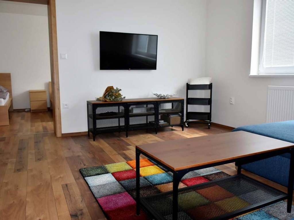 Obývací pokoj: chytrá TV 43", rozkládací sedačka