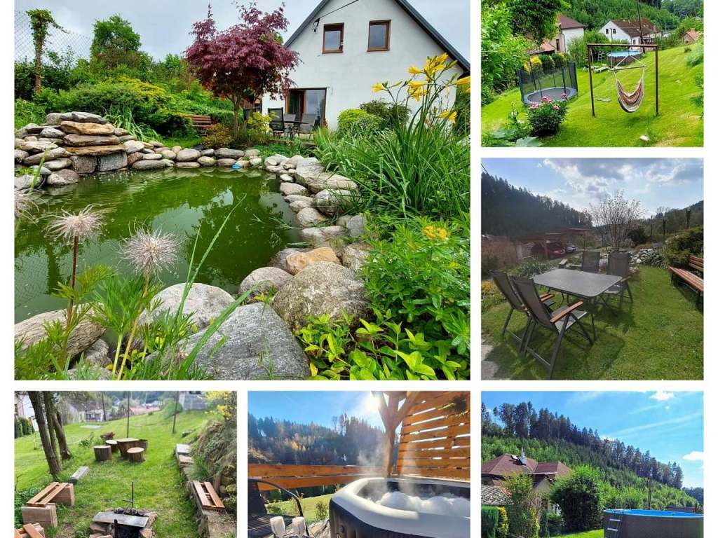 Byt v rodinném domě se zahradou posezením u rybníčku venkovním ohništěm, grilem a bazénem, který je k dispozici po dohodě. Lze využít po objednání i vířivku se slanou vodou.