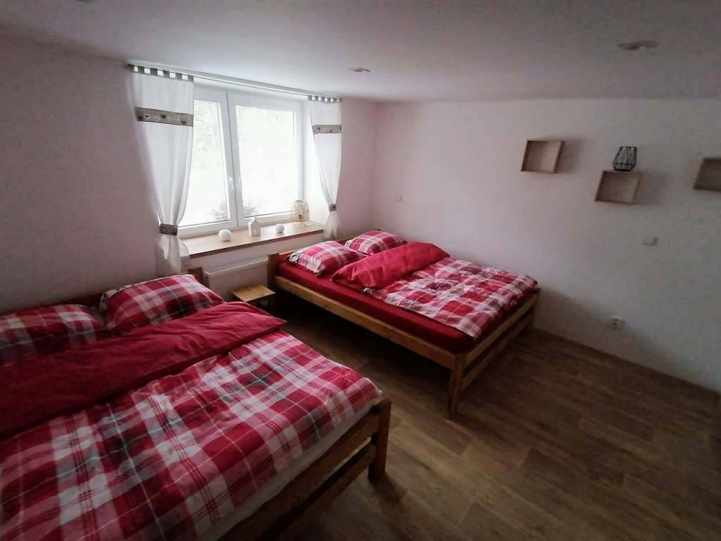 1x ložnice se 4 lůžky a 1x ložnice se 2 lůžky. Postýlky možné 2 až max. 4 přidat. Dále je zde pokoj s kuchyňskou linkou posezením a TV a další 2 lůžka na pohodlné rozkládací sedačce.