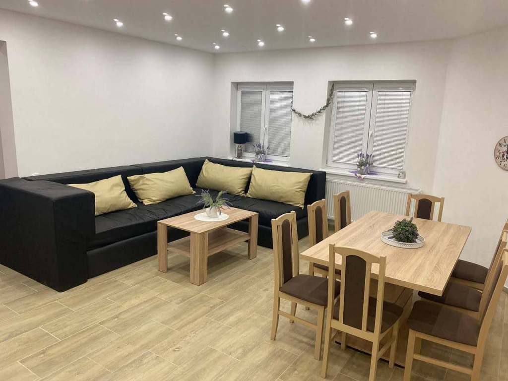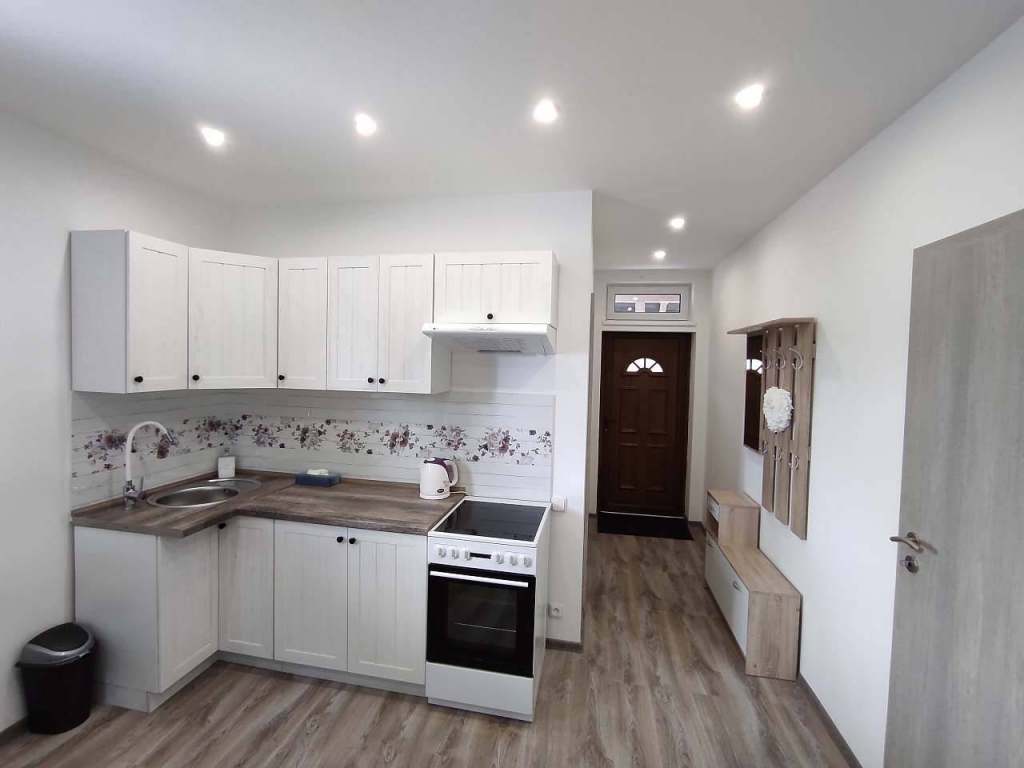 Apartmán Hortenzie: Vybavení: Plně vybavená kuchyňská linka. Lednice s mrazákem, varnou konvicí, dvou plotýnkový vařič, talíře, příbory, skleničky, atd., Jídelní stůl pro 4 osoby. Ložnice s velkou manželskou postelí a je vybavena nočními stolky s lampičkou, šatní skříní, přikrývky s povlečením a ručníkem. Prostorná koupelna se sprchou, závěsné WC, velké umyvadlo se zrcadlem, žebříkový radiátor pro lepší sušení a pračka. Obývací pokoj s rozkládací pohovkou na dvě plnohodnotná lůžka.