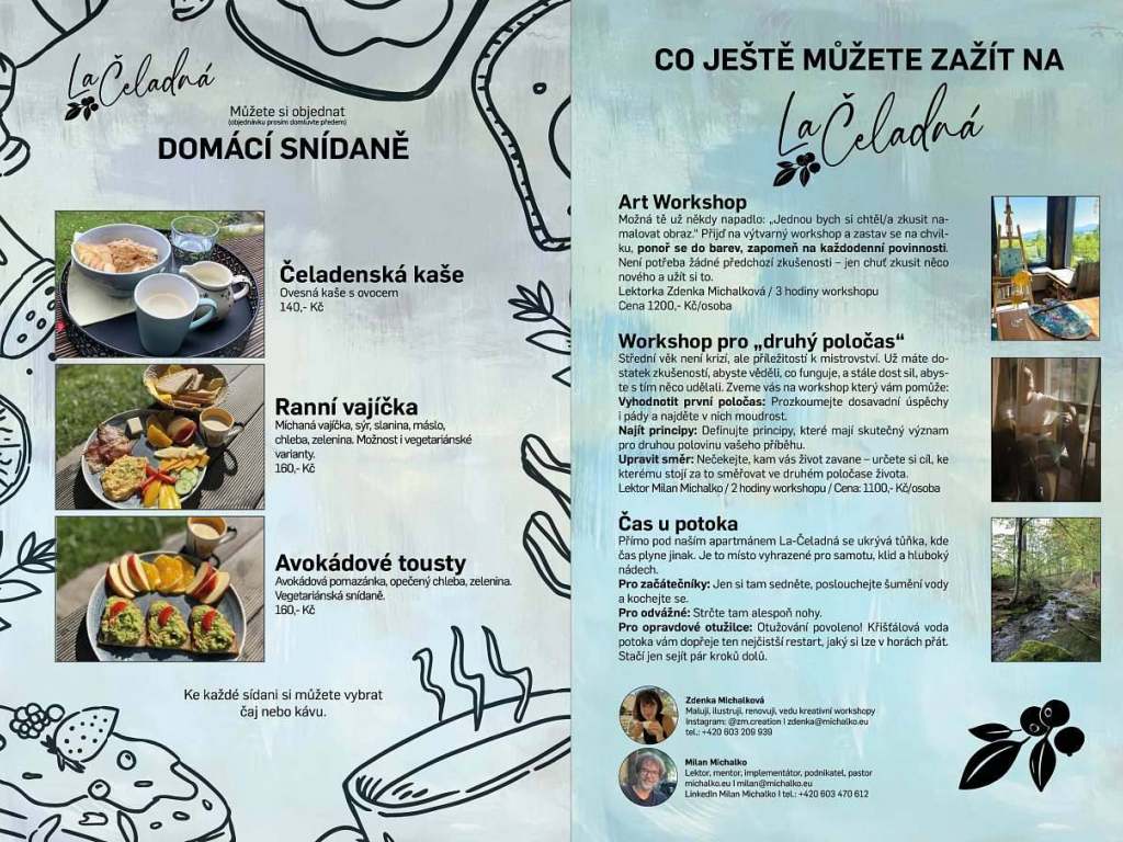 | Uvedené ceny jsou pro 2 dospělé osoby. Příplatek za 1 dítě do 15 let je: letní sezóna 800,- Kč, zimní sezóna 600,- Kč / den. Záloha při rezervaci apartmánu 1000,- Kč. Příplatek za psa do 5 kg je 100,- Kč, za psa nad 5 kg 150,- Kč / den. Letní sezóna: od 1. července do 30. září Možnost přiobjednání skvělé "Čeladenské snídaně". Více informací ve fotografiích. Měli byste zájem o Art Workshop? Více informací ve fotografiích. Přes týden (mimo sezónu) je možné minimální délka pobytu 1 den, přes víkend je minimální délka pobytu 2 dny. Letní sezóna: 1.6.-30.9. Ceny se v průběhu roku mohou lišit v závislosti na svátky, prázdniny a pod. | |