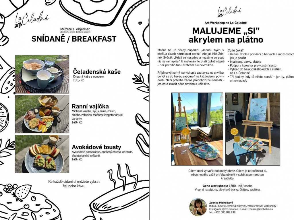 | Uvedené ceny jsou pro 2 dospělé osoby. Příplatek za 1 dítě do 15 let je: letní sezóna 1500,- Kč, zimní sezóna 1100,- Kč / den. Záloha při rezervaci apartmánu 1000,- Kč. Příplatek za psa do 5 kg je 100,- Kč, za psa nad 5 kg 150,- Kč / den. Letní sezóna: od 1. července do 30. září Možnost přiobjednání skvělé "Čeladenské snídaně". Více informací ve fotografiích. Měli byste zájem o Art Workshop? Více informací ve fotografiích. Přes týden (mimo sezónu) je možné minimální délka pobytu 1 den, přes víkend je minimální délka pobytu 2 dny. Letní sezóna: 1.6.-30.9. Zimní sezóna: | |