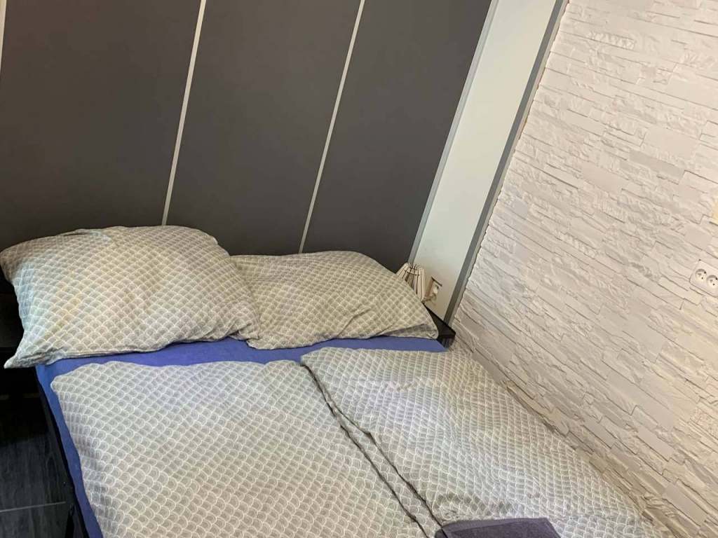Manželská postel s novou německou matrací o rozměrech 190x140cm s nočními stolky a lampičkou. Rozkládací pohovka.