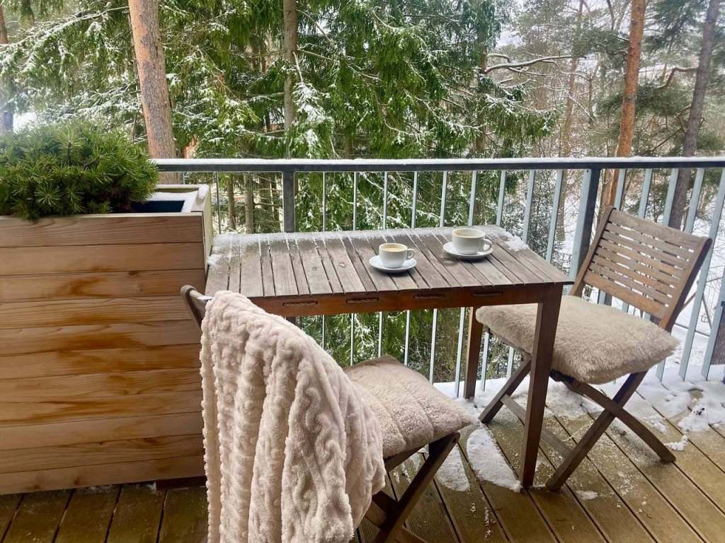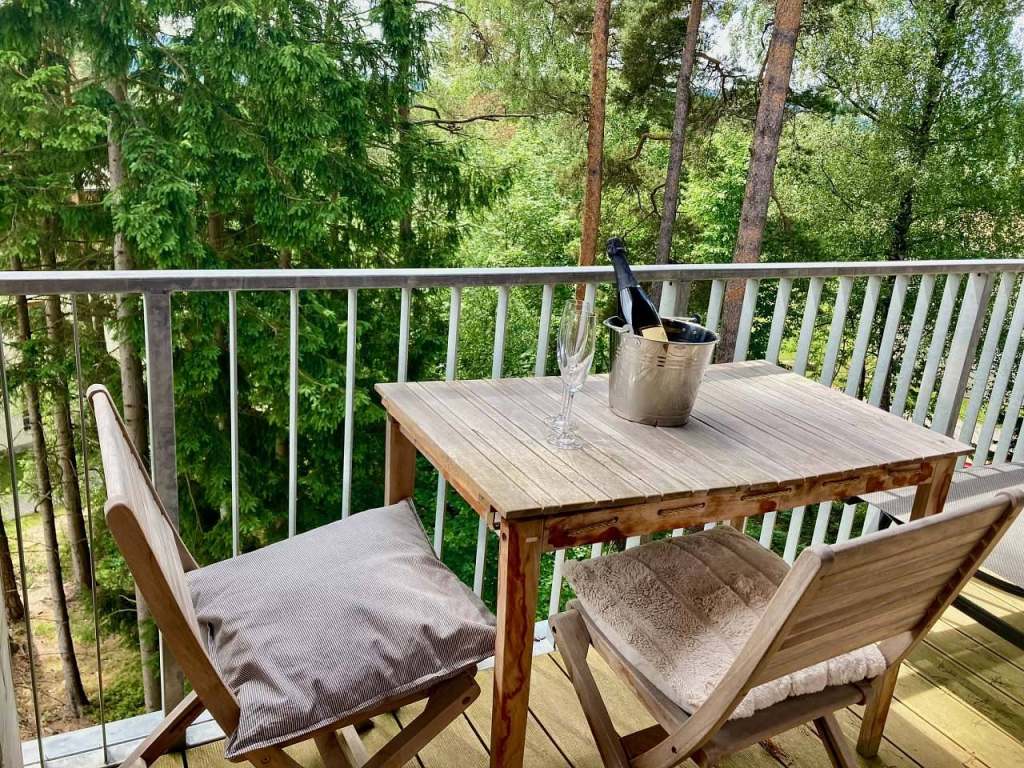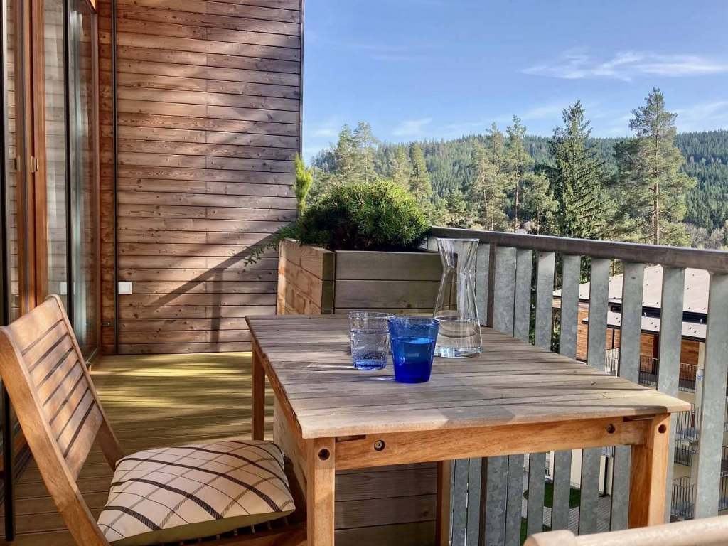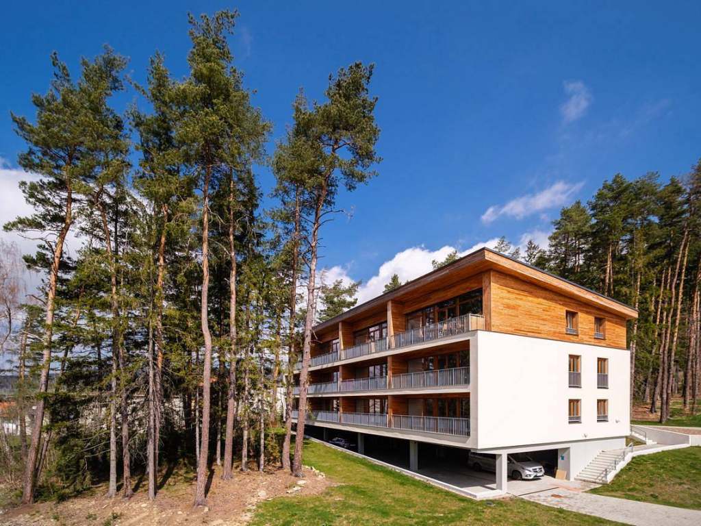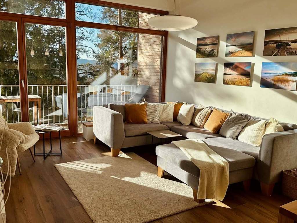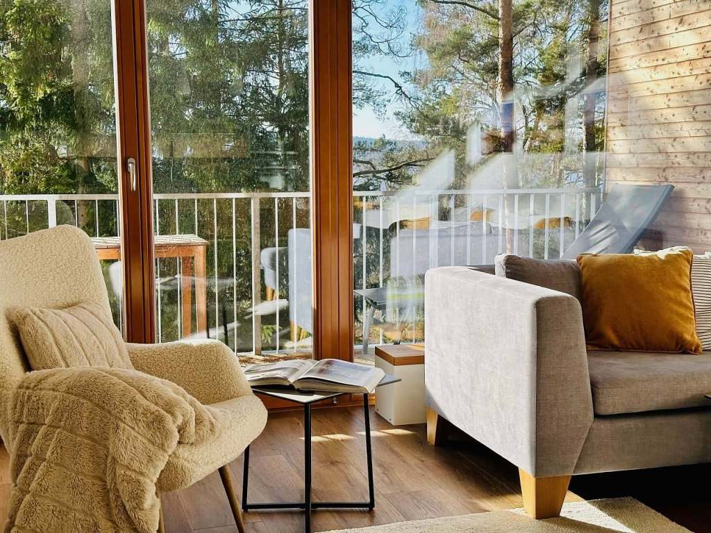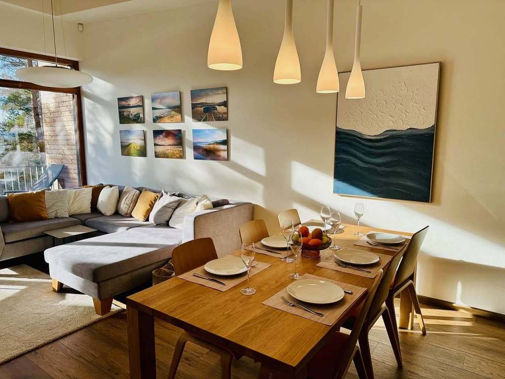Centrem apartmánu je velký otevřený obývací pokoj spojený s plně vybavenou kuchyní a jídelním stolem pro 6 osob. V prostorném obývacím pokoji s vysokým stropem a dřevěnými trámy se nachází televize a velká pohodlná sedací souprava, která případně poslouží jako lůžko pro jednu až dvě osoby. Z obývacího pokoje lze vstoupit na terasu s posezením, kde můžete relaxovat a vychutnat si nádherný výhled do okolní přírody, korun stromů a na Lipenskou přehradu. Přímo u apartmánu se nachází malé dětské hřiště, na které je z terasy perfektní výhled. Rodiče si tak mohou v klidu dopřát kávu nebo snídani, zatímco si jejich děti nedaleko bezpečně hrají. Apartmán má dvě ložnice s prostornými, pohodlnými manželskými postelemi vybavenými zdravotními matracemi. V jedné z ložnic je umístěna pohovka, která po rozložení poskytne lůžko pro jednu osobu. Ložnice a obývací pokoj jsou vybaveny elektrickými žaluziemi, které zajistí skvělé zatemnění místností a zároveň příjemný chlad v parných dnech.