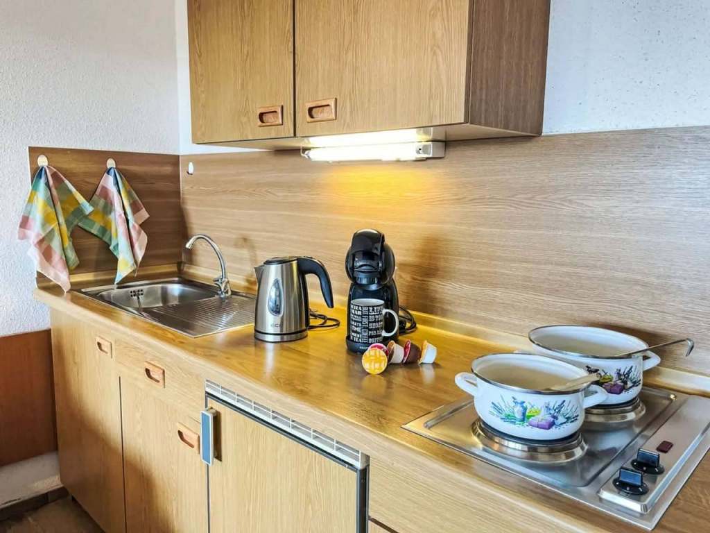 V apartmánu je vybavená kuchyňská linka s ledničkou, rychlovarná konvice, mikrovlnná trouba, 2 plotýnky na vaření, utěrka, jar, houbička na nádobí. Je zde kávovar Nescafé Dolce Gusto na kapsle. Jídelní stůl a čtyři židle.
