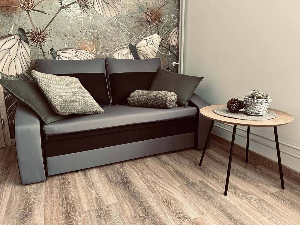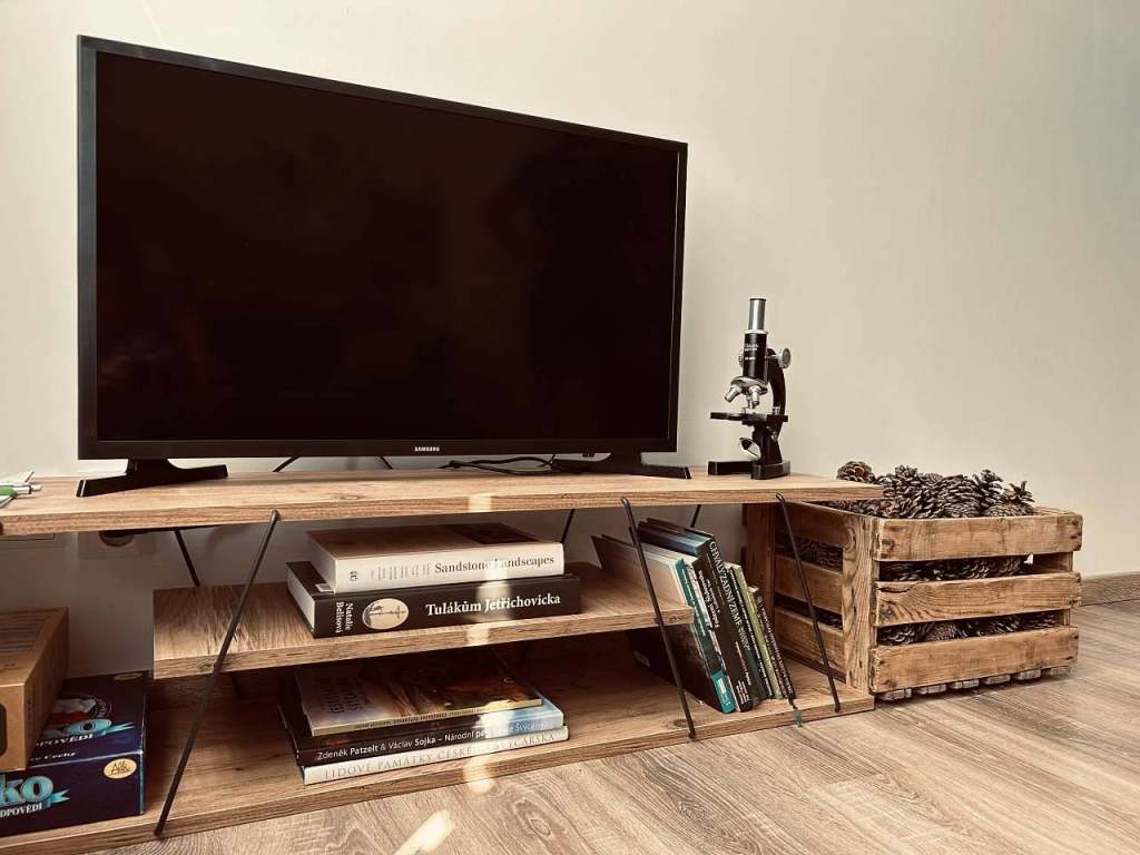 Obývací místnost: je vybavená rozkládací pohovkou, která poslouží jako plnohodnotné lůžko pro jednoho dospělého člověka či dvě děti (šíře 140 cm), k dispozici je stolek se smart televizním přijímačem a knihovnička s publikacemi (knihy o Českém Švýcarsku, mapy, společenské hry).