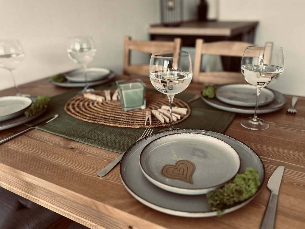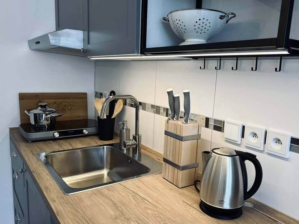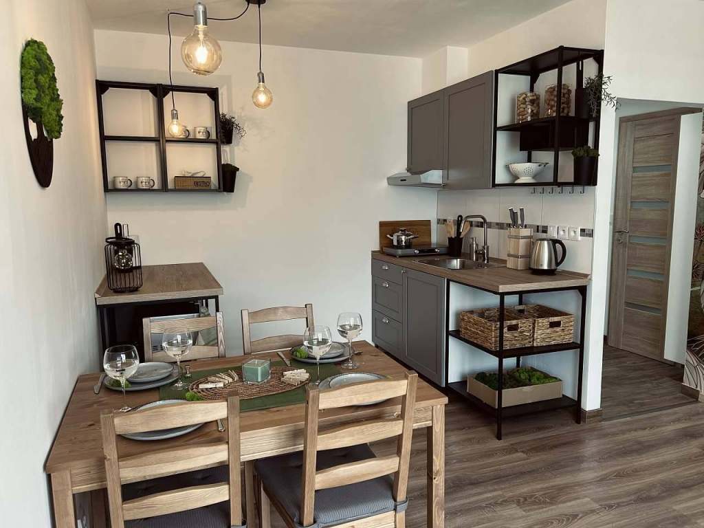 Kuchyně: plnohodnotně vybavený kuchyňský kout s dřezem, sklokeramickou dvouplotýnkou, rychlovarnou konvicí, mikrovlnnou troubou a ledničkou s mrazícím boxem, jídelní stůl pro čtyři osoby.