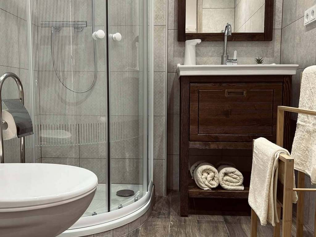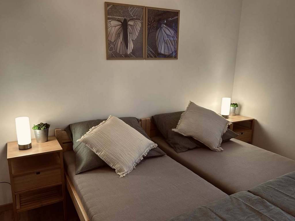 Ložnice: dvě samostatná lůžka s nočními stolky s osvětlením, prostorná šatní skříň a němý sluha, ložní prádlo je v ceně ubytování.