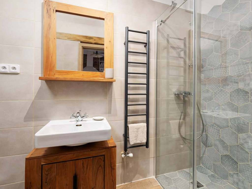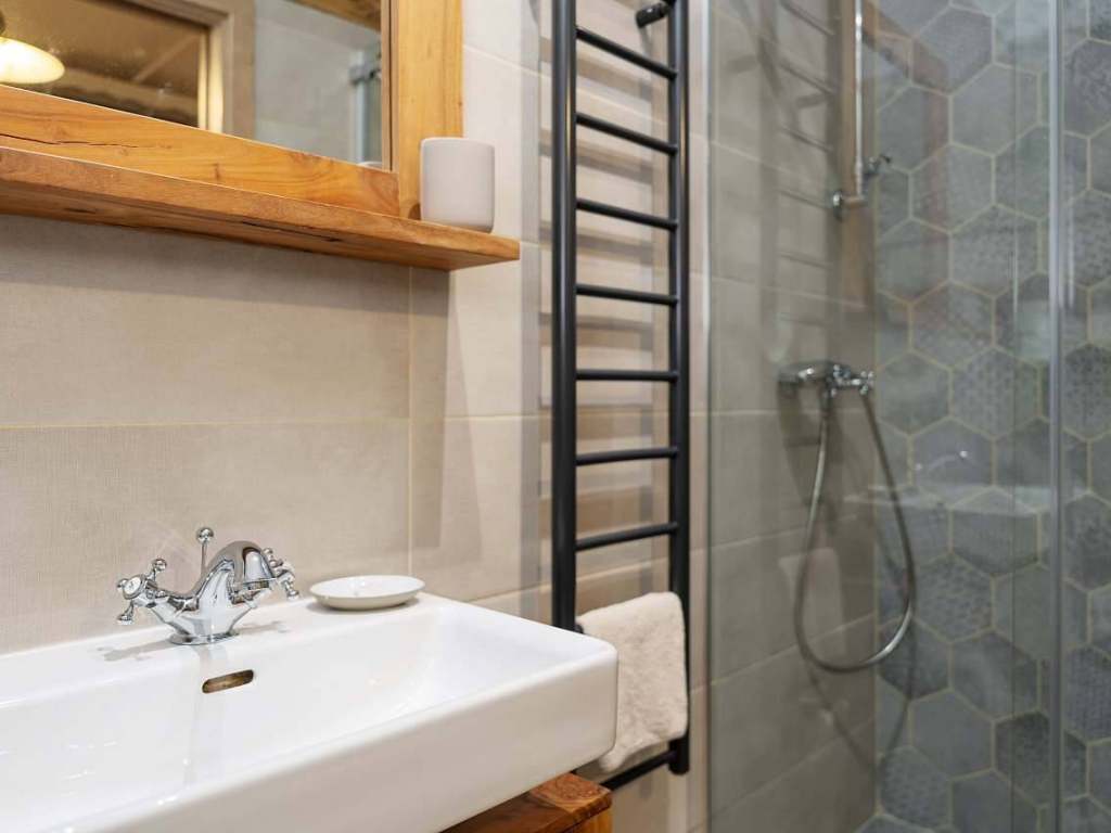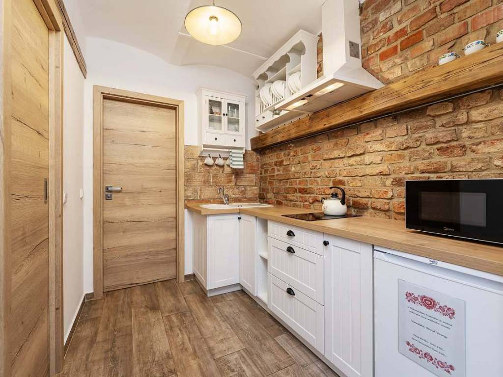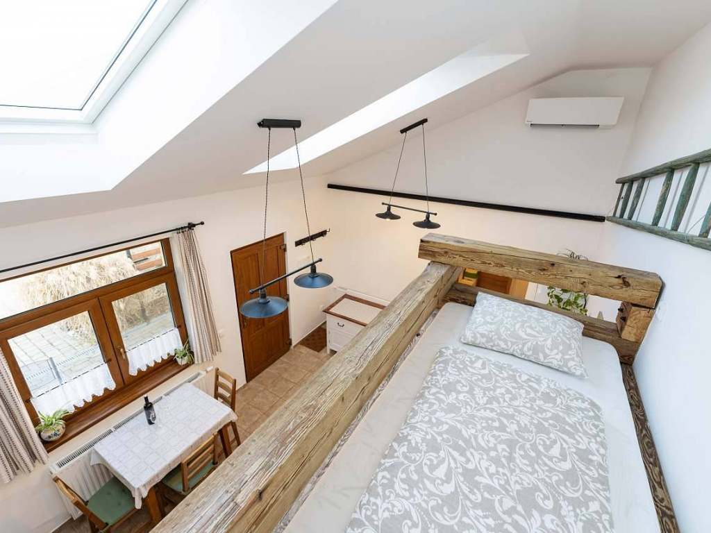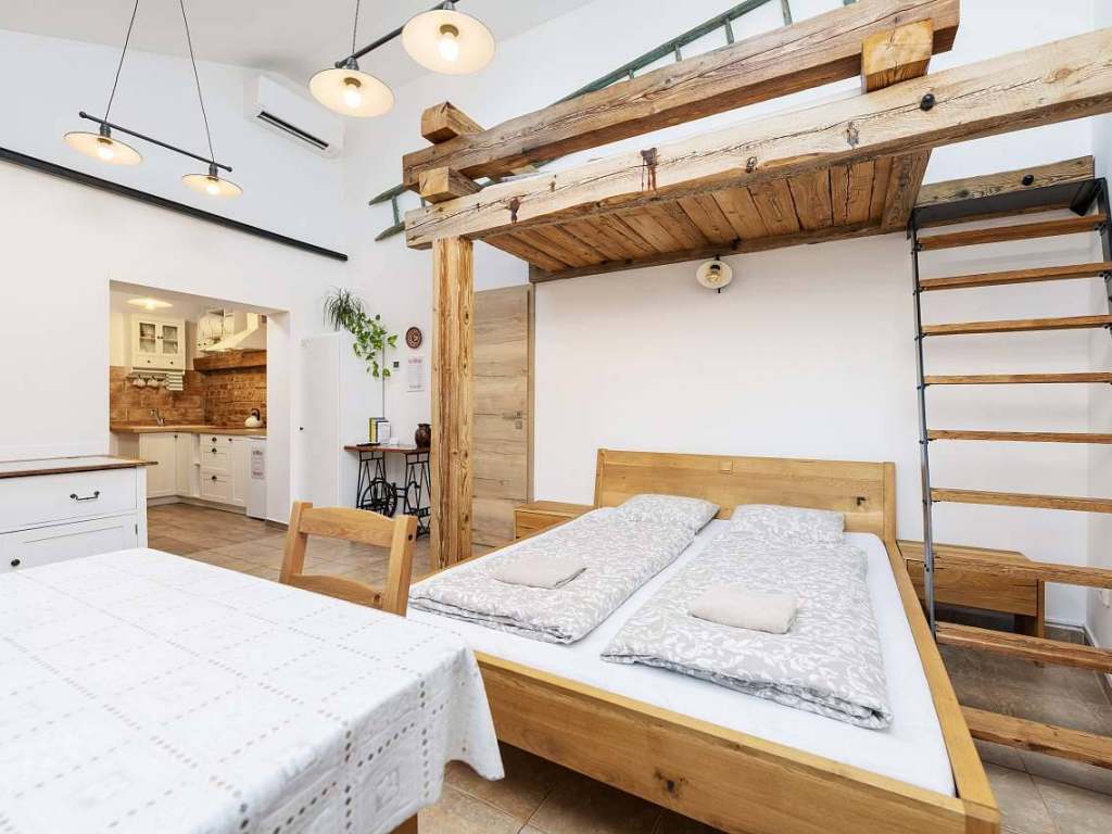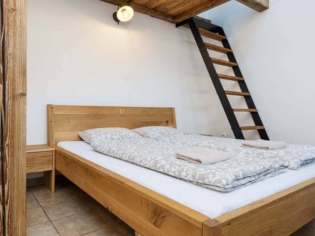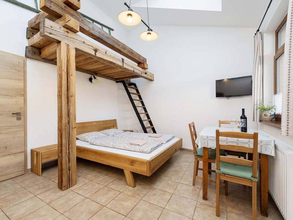 Apartmán s terasou má 2 pokoje, kuchyň s jídelnou, koupelnou a WC. V prvním pokoji se nachází manželská postel s TV. Ve druhém pokoji se nachází 1 jednolůžko, gaučová postel, která se může rozložit pro 2 osoby a neposlední řadě, trámová manželská postel umístěná pod vyvýšeným stropem. Kuchyň je vybavená veškerým potřebným nádobí, lednicí s mrazákem, indukční deskou, mikrovlnnou troubou, standardní troubou a toustovačem. Venku je možné posedět na střešní terase s výhledem na obec. Součástí terasy je venkovní sprcha.