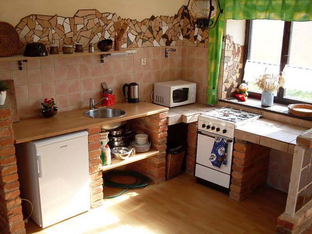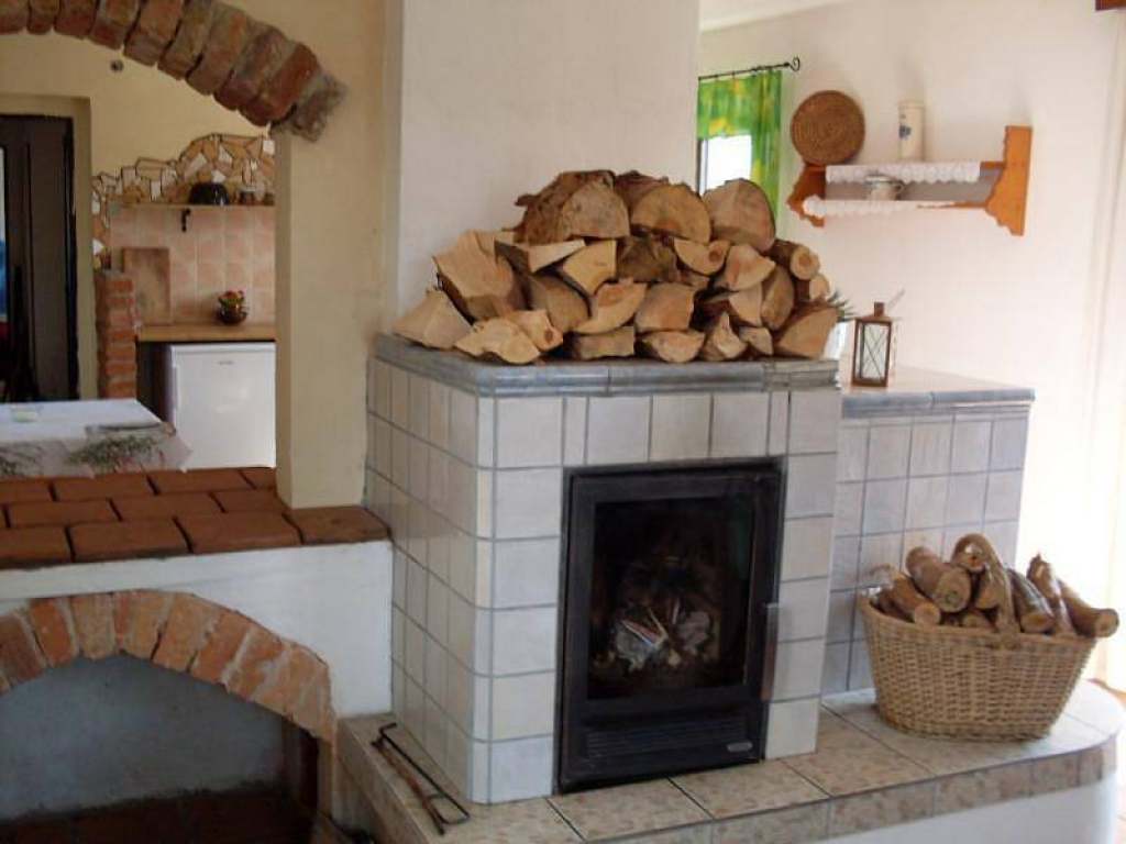 Kuchyně: kuchyňská linka, nádobí, plynový sporák s troubou, lednička, varná konvice, mikrovlnka, možnost vaření na plátových kamnech, lavice se stolem. Obývák: rozkládací sedací souprava, krbová kamna, ležení na peci. Ložnice: tři postele, skříňky, plovoucí podlaha. Veranda: botník, věšák, skříňky. Terasa: zahradní nabytek, slunečník, dětské hračky.