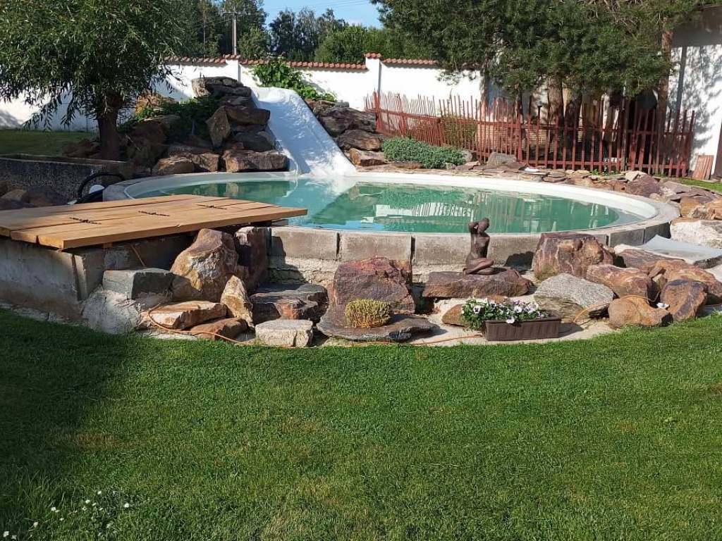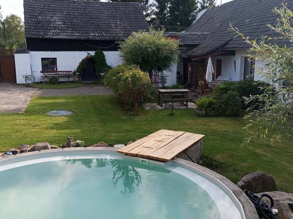 Na zahradě k dispozici bazén, dětské pískoviště, ohniště, zahradní nábytek, slunečník, trampolína.