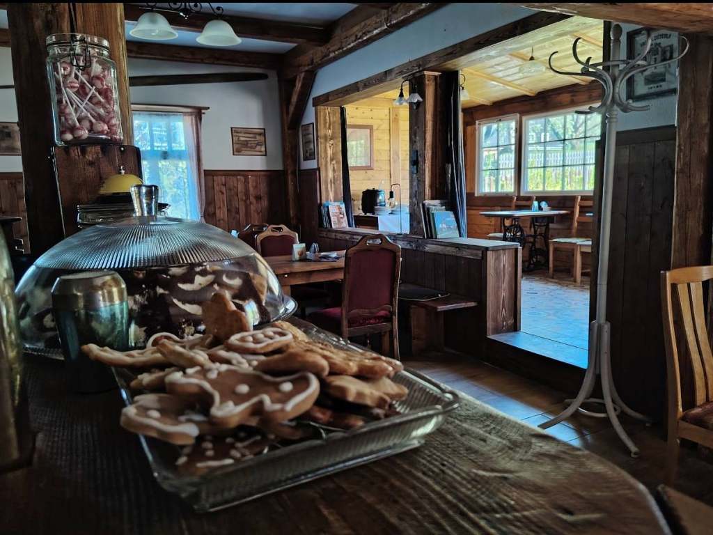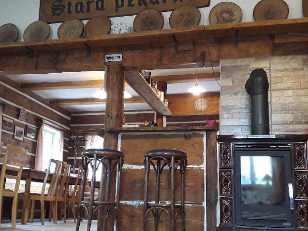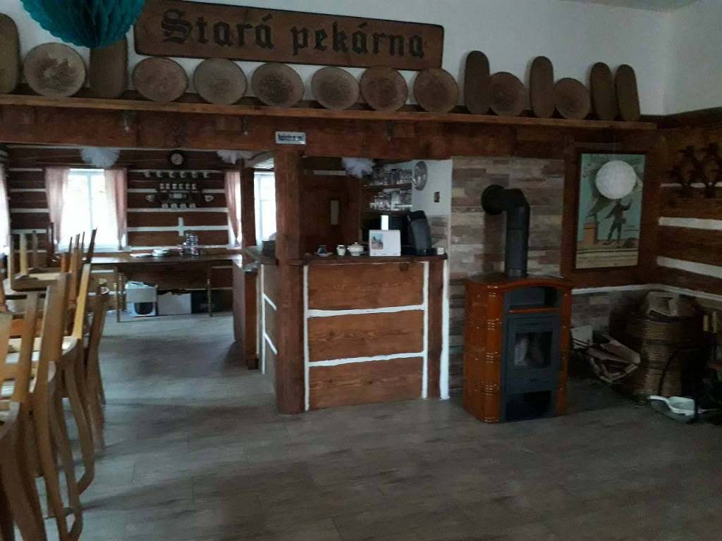 Kuchyň plně vybavená s kávovarem a v případě pronájmu celého objektu je možnost využívat i kuchyň v přízemí. Jinak v případném pronájmu spodního patra je plně vybavená kavárna. Restaurace je v obci s možností stravování a obchod v nedalekých Rynolticích.