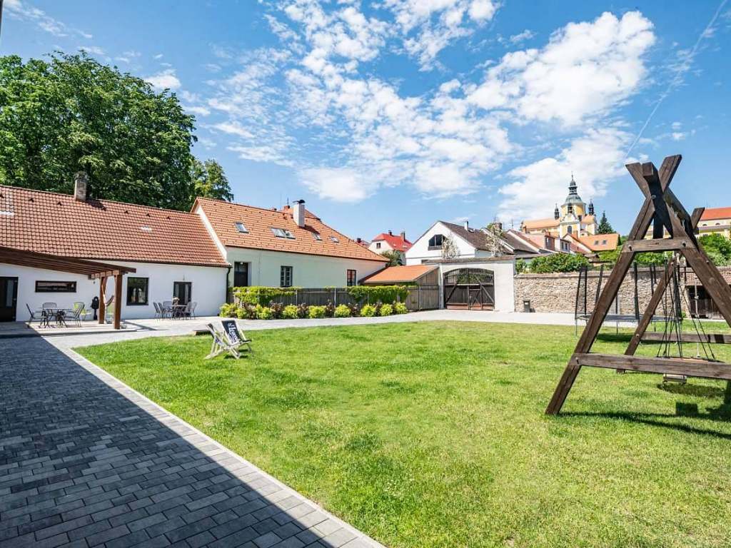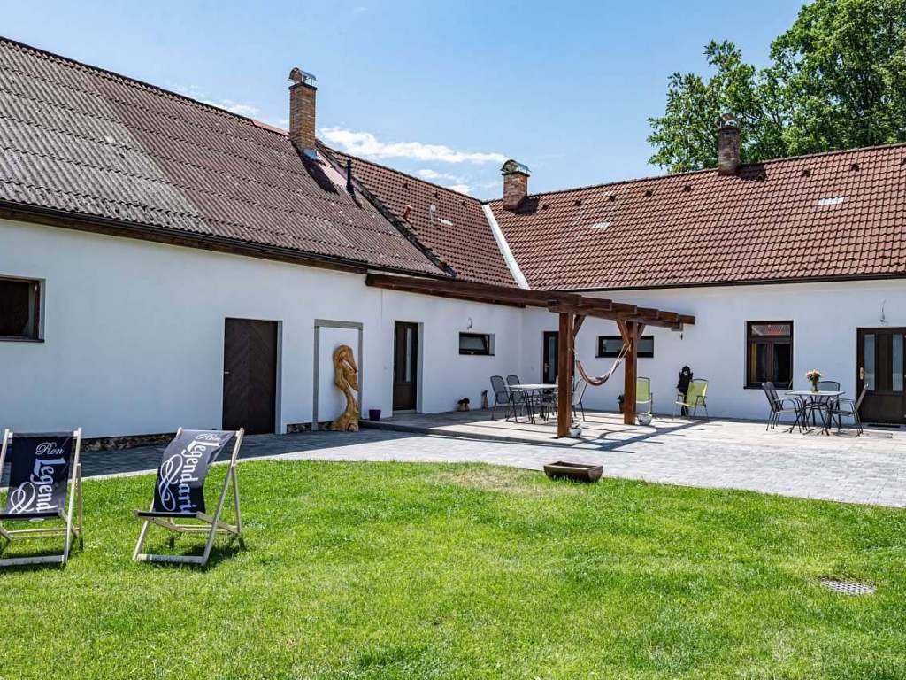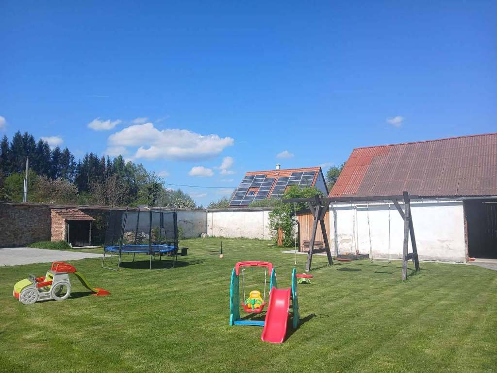 K dispozici je vám velký, uzavřený dvůr s venkovním posezením a multifunkční hřiště pro děti, ohniště s roštem a také krytá stodola se sezením a pingpongem.