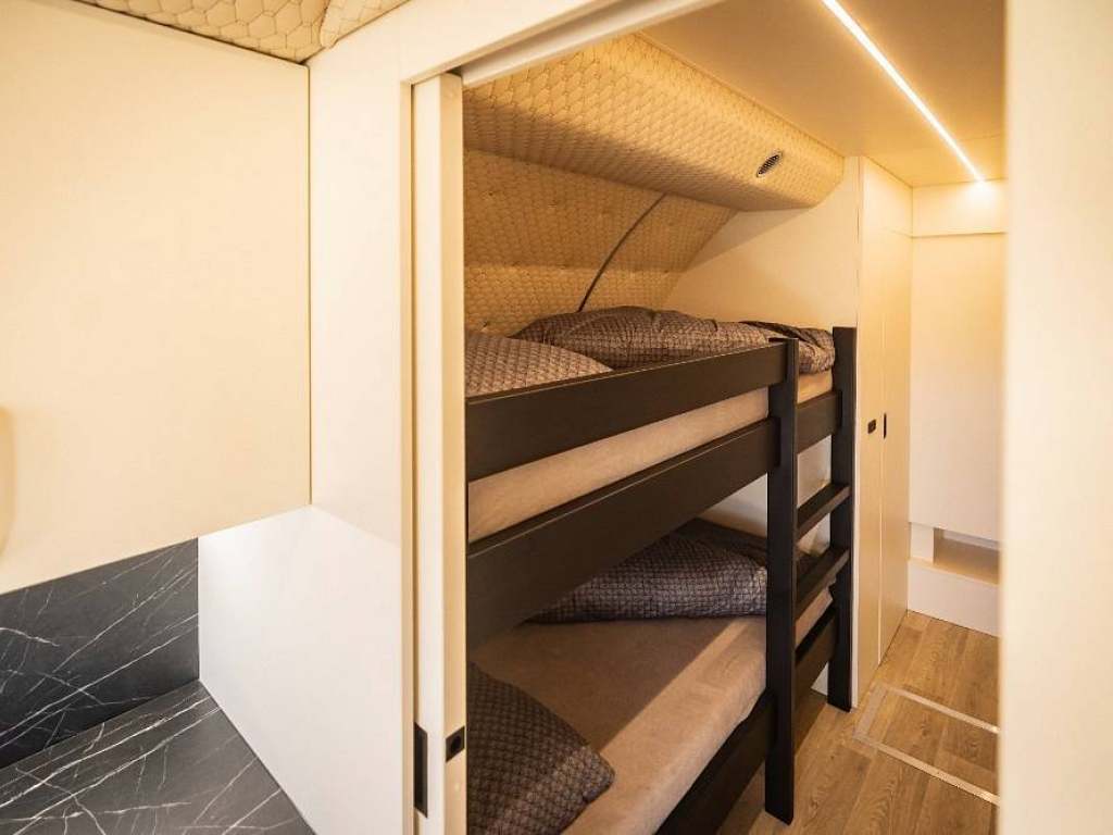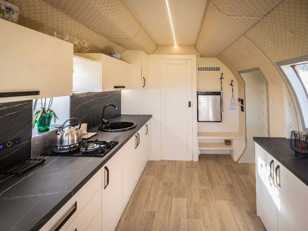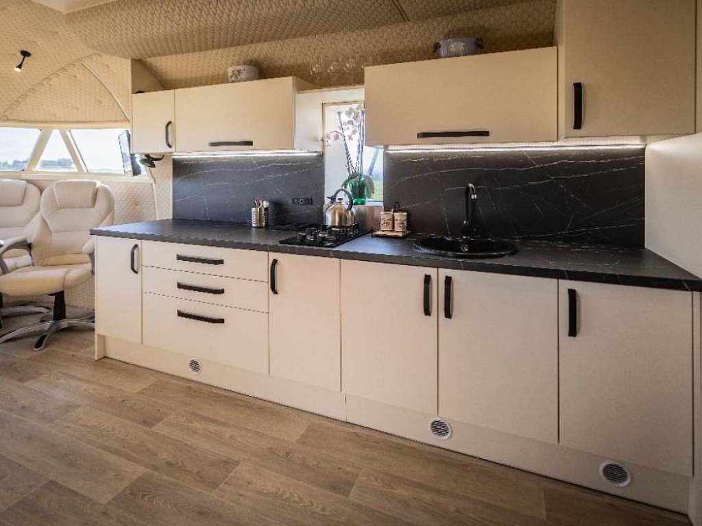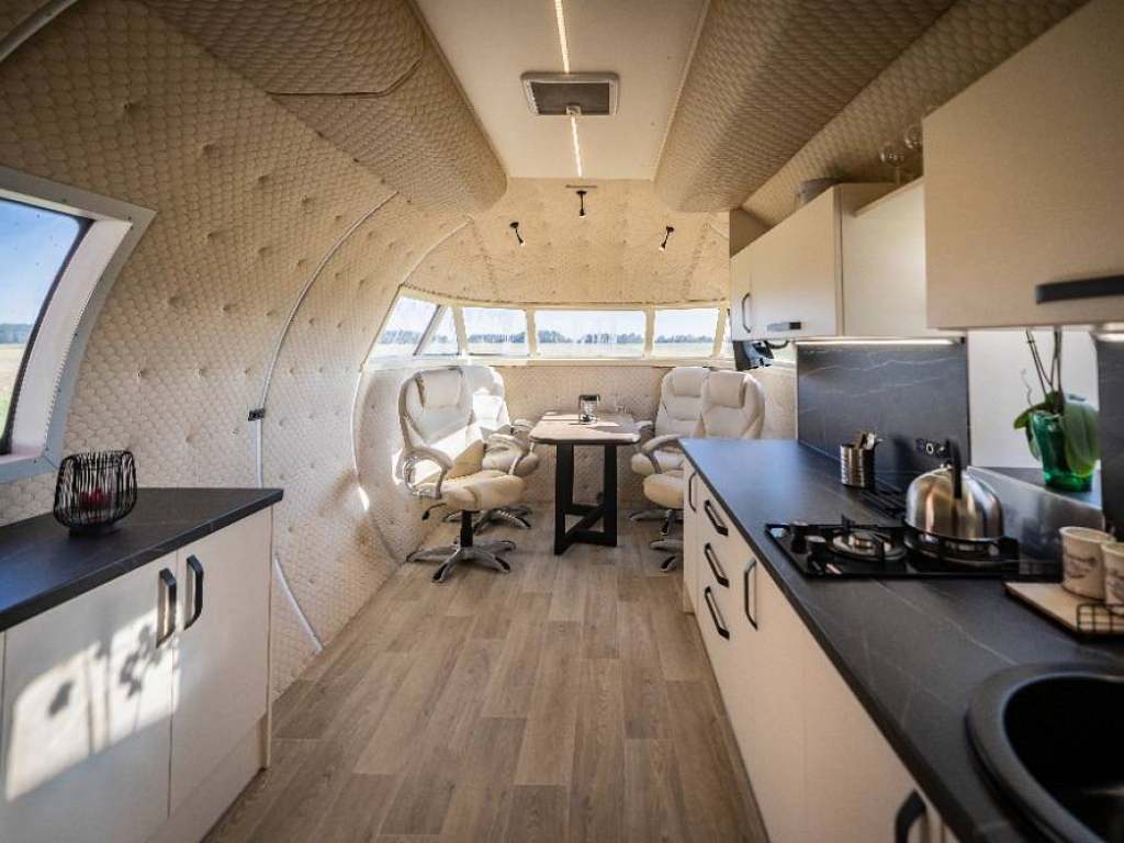 Společná obývací část v přídi letadla je vybavena: kuchyňskou linkou s vybavením pro vaření, plynovou dvouplotýnkovou deskou, dřezem a lednicí, TV, jídelní stůl pro 4 osoby, věšáková stěna s botníkem u vst. dveří. Střední část letadla je vybavena palandou a je zde v protější části technická místnost s vybavením pro fotovoltaiku. Dále se ve střední části nachází samostatné WC a samostatná koupelna se sprchovým koutem a umyvadlem. V zadní ocasní části se nachází zvýšená manželská postel. Celý objekt je energeticky tzv. ostrovní - hybridní poháněný fotovoltaikou a jako záložní zdroj při vybití baterií je elektrocentrála. Vše je zde provozováno na 12 V nebo na plyn. V zimních měsících vytápěno naftovým nezávislým topením. Odvětrání objektu je zajištěno řízenou výměnou vzduchu a střešními okny s odtahovým ventilátorem.